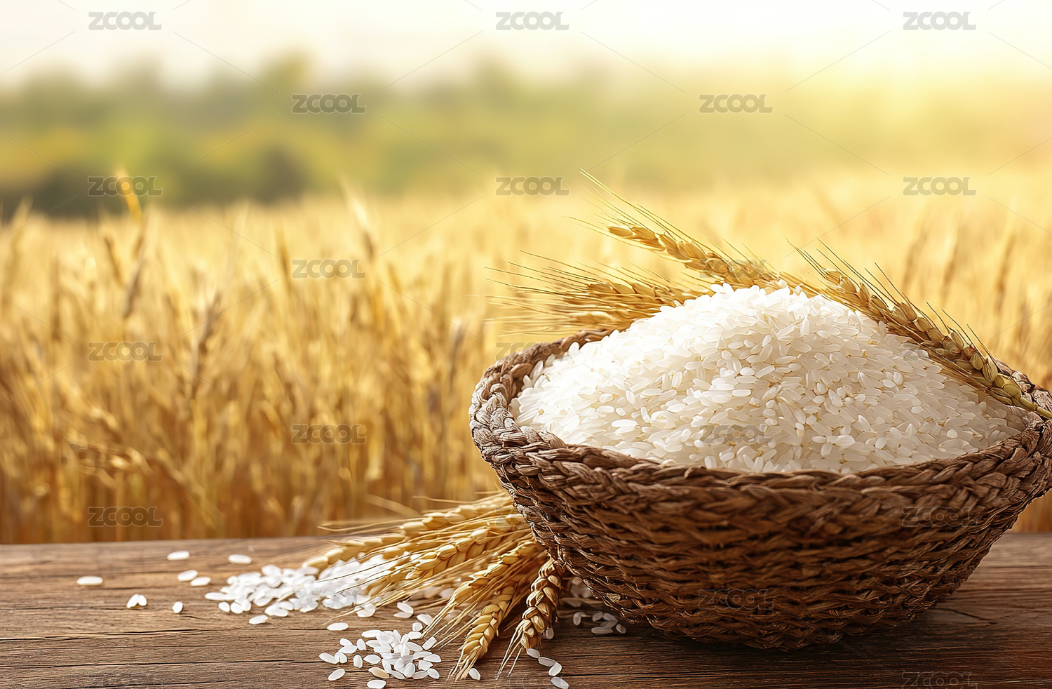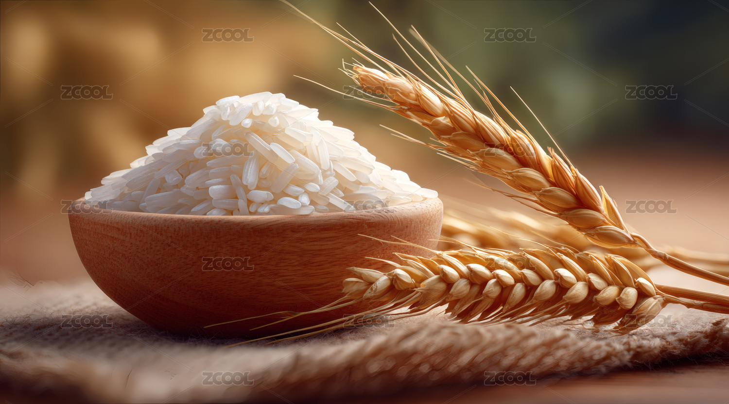 桌面上一碗大米和稻谷水稻背景,世界粮食日