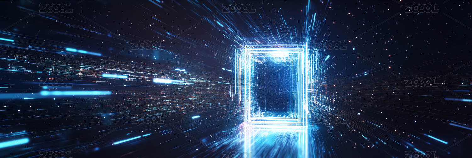 抽象的数字立方体光线和粒子在蓝色空间穿梭