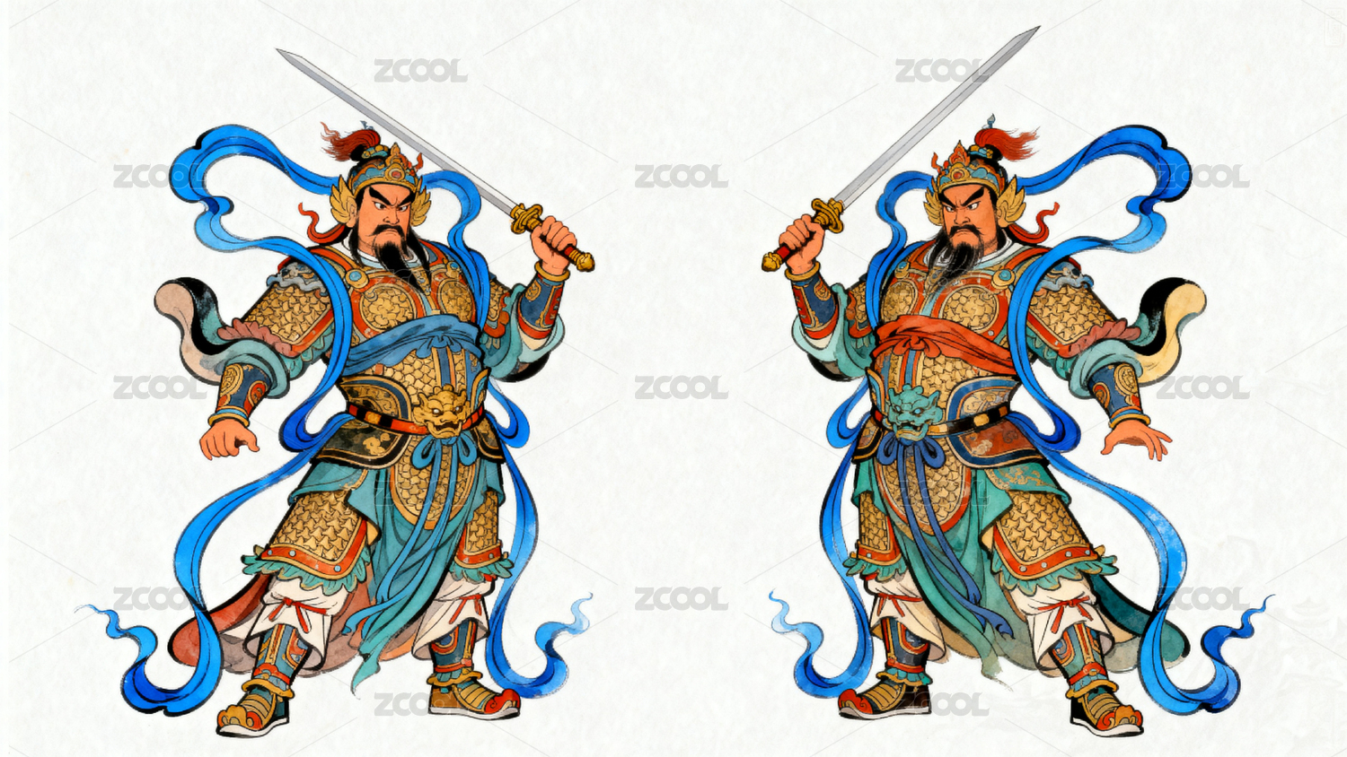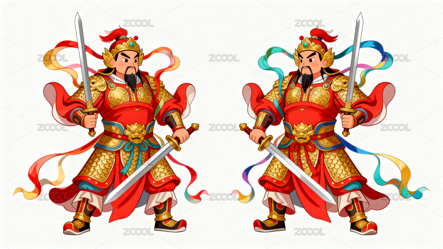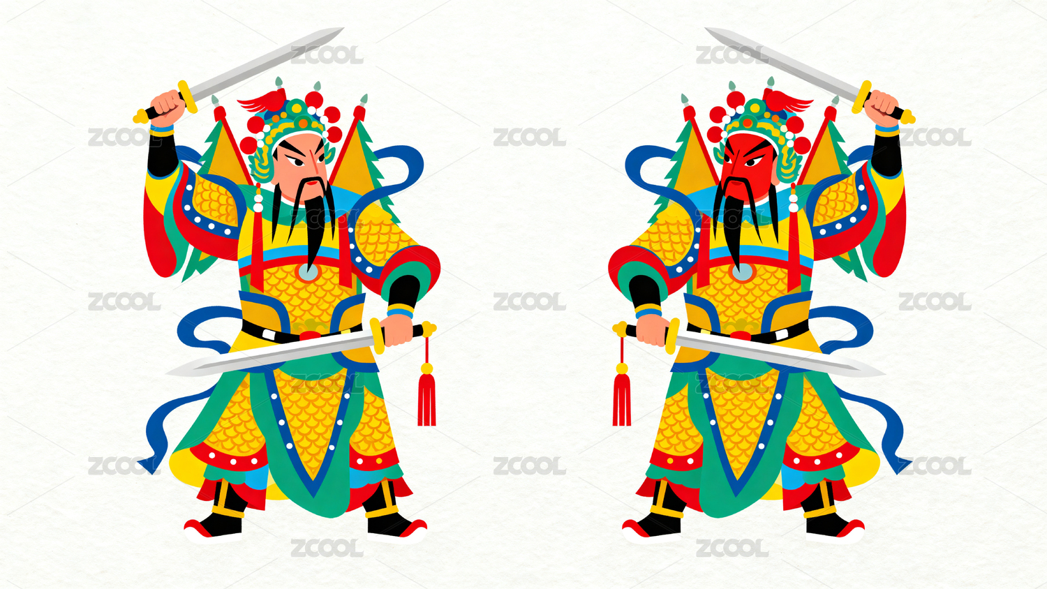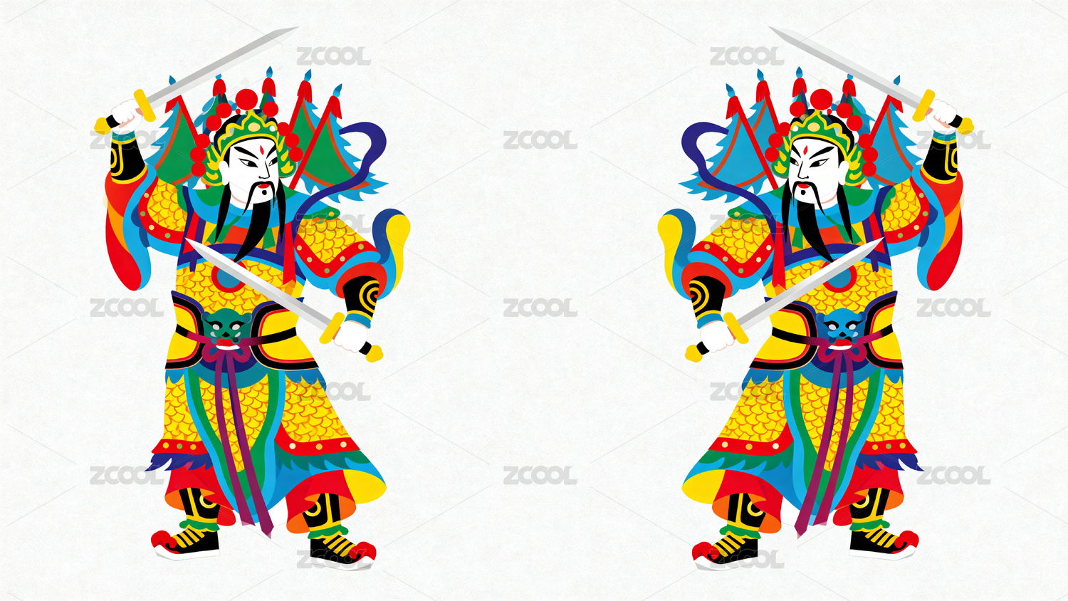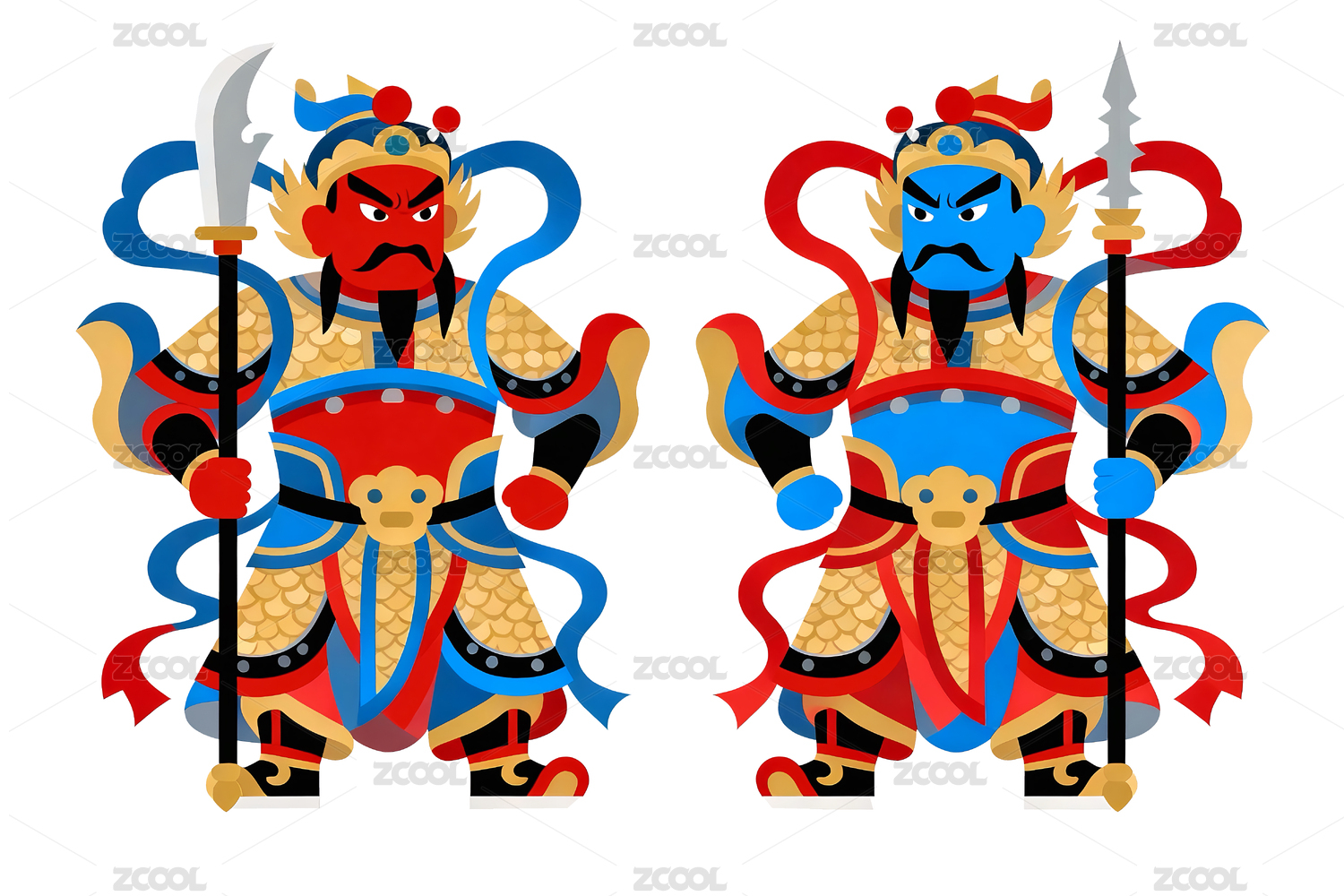 一对门神古装人物横眉冷对手拿兵器刀剑