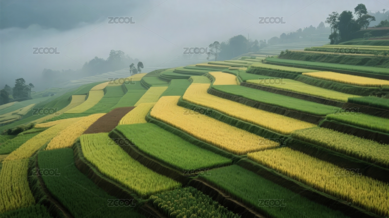 云雾缭绕的山前成片黄绿相间的稻田,中国福建武平梧地