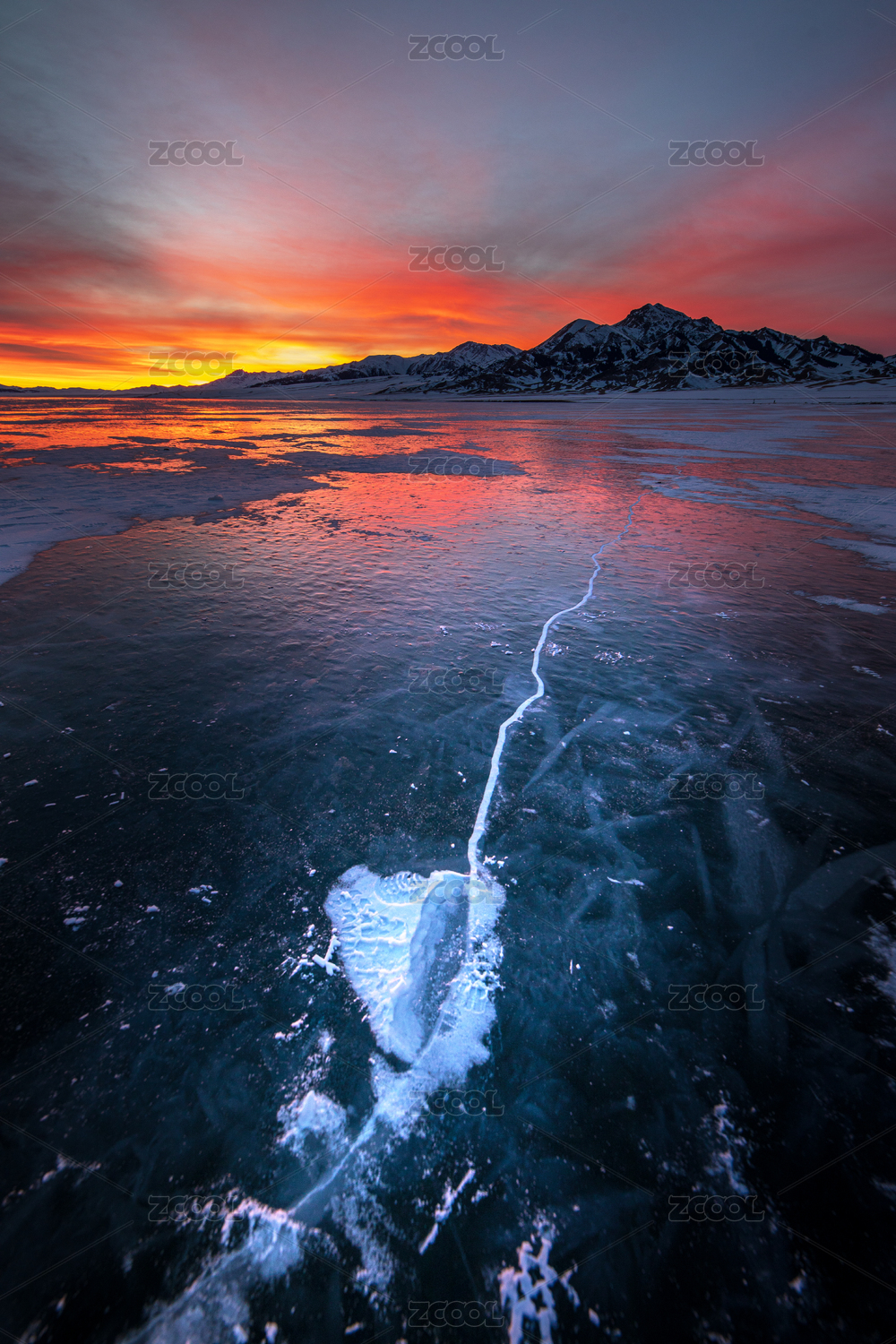 中国新疆赛里木湖蓝冰夕阳冰裂