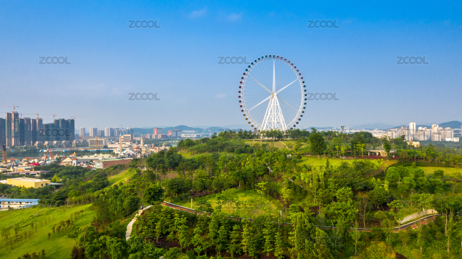 航拍春季蓝天下的广西柳州市游乐城和摩天轮全景