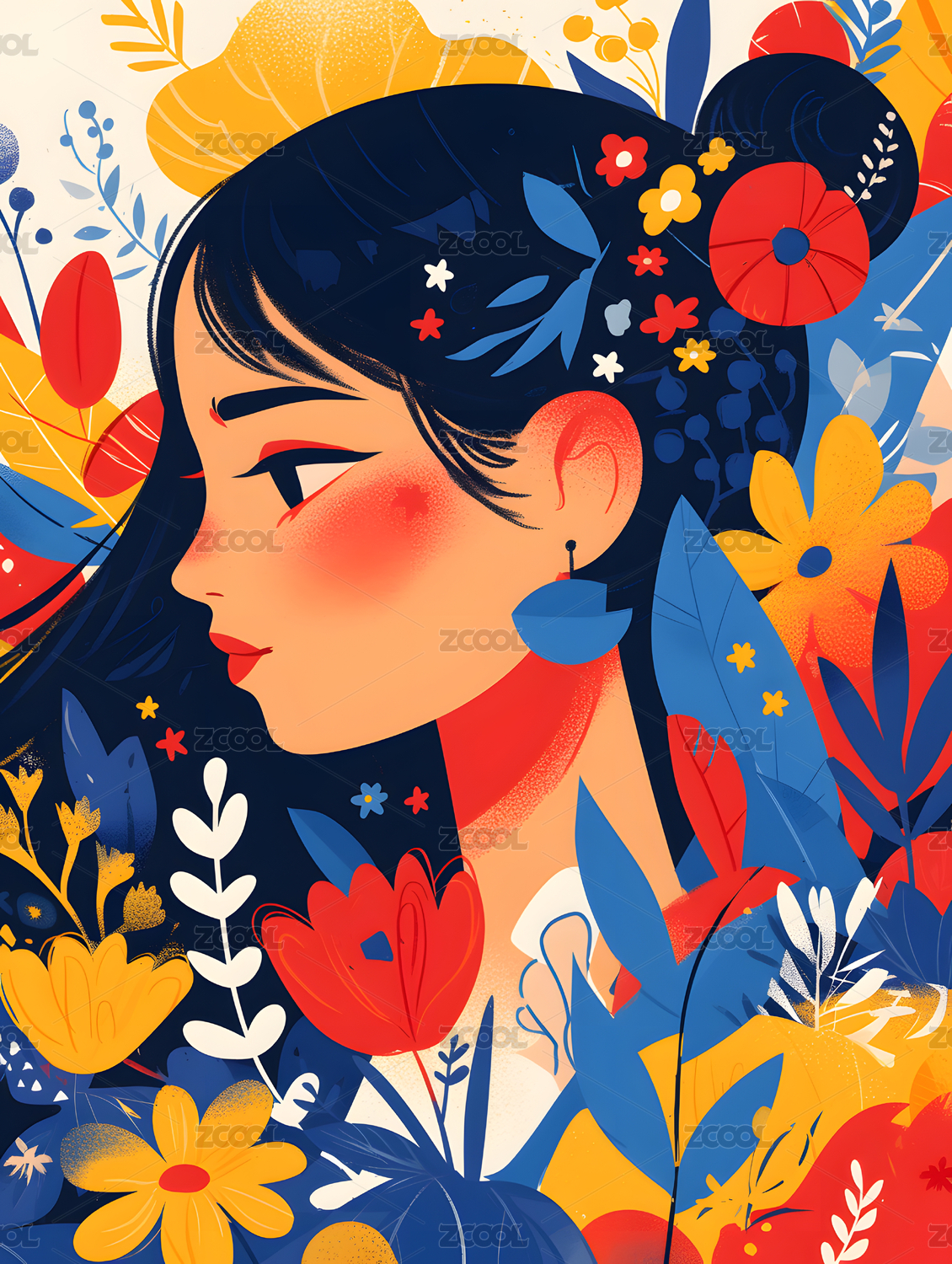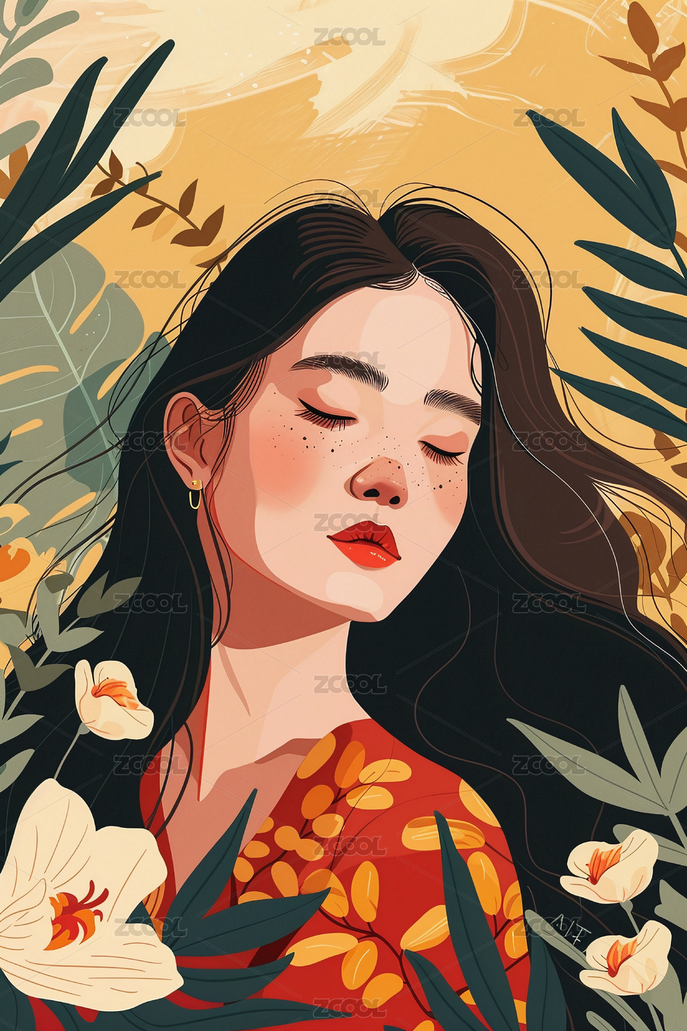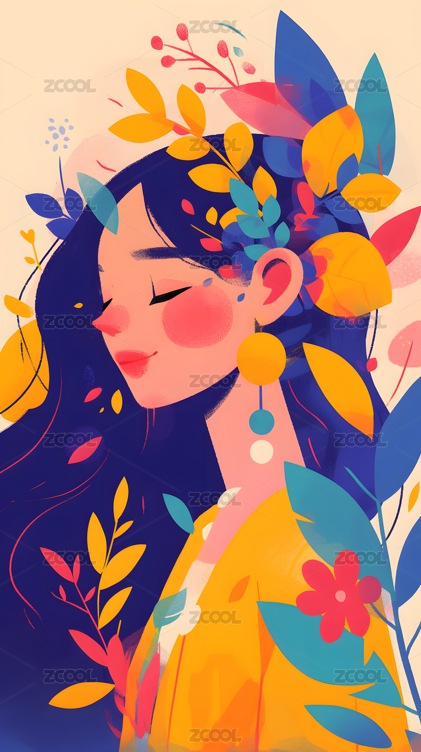 飘逸长发的美女与植物清新唯美插画