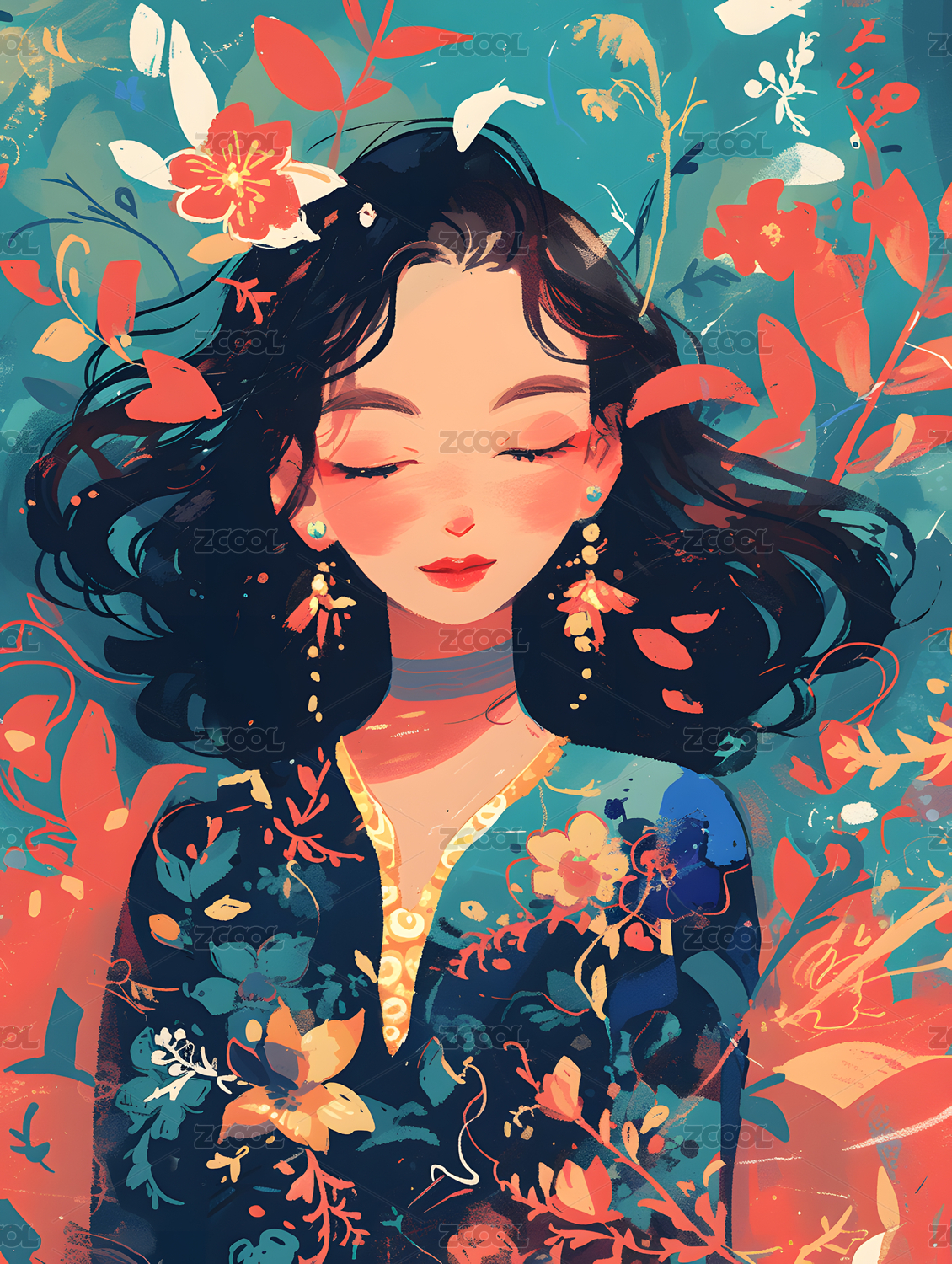 卷发,女孩,闭眼,连衣裙,植物,耳环,美女