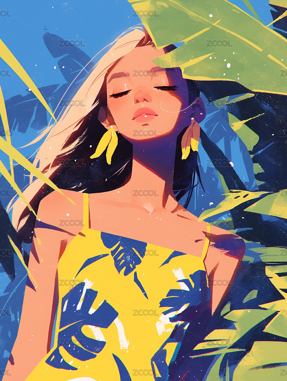 夏日热带风情的人像插画