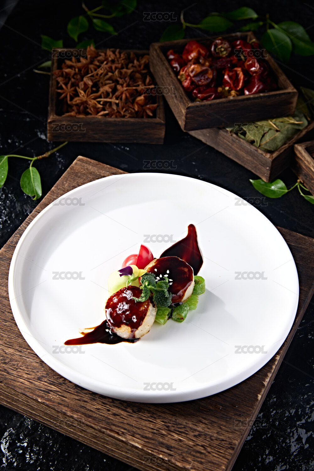 高档中餐美食浇汁烧瑶柱贝丁带子