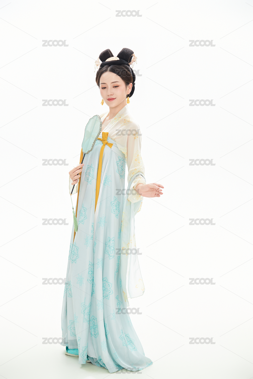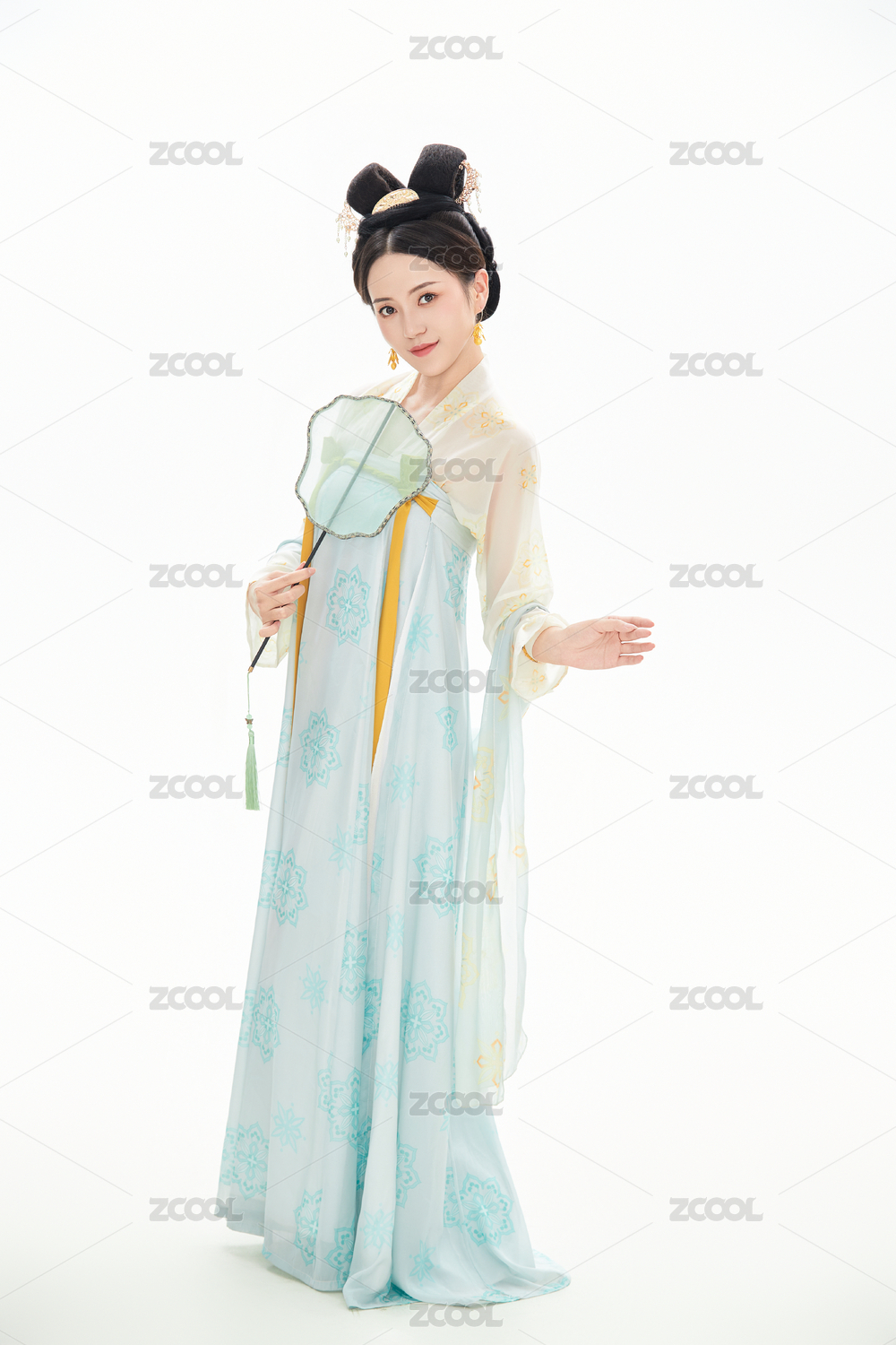 白色背景下穿着中国唐朝服饰的女性