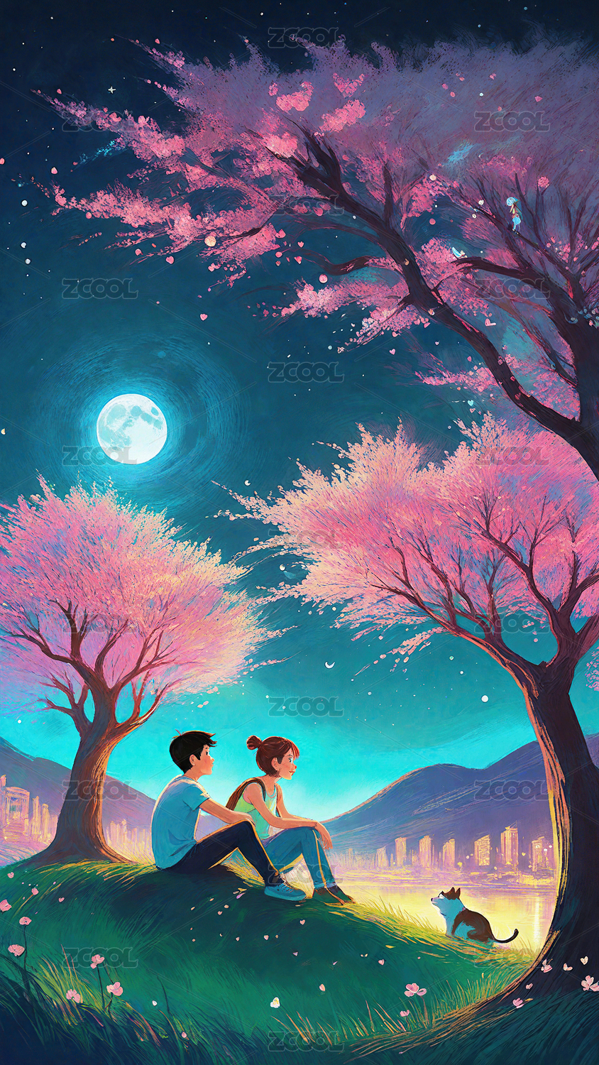圆月当空七夕情人场景插画