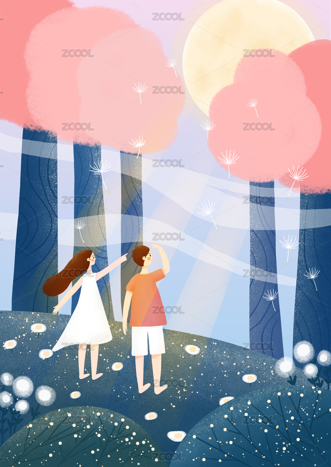 落满星星的星空下牵手的情侣手绘插画,月亮旁的情侣梦幻插画,情人节插画