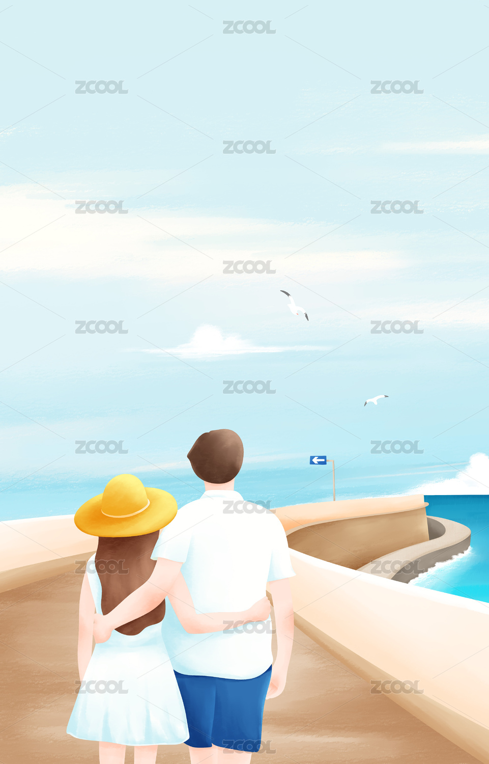 夏季情侣在海边度假散步插画 竖版