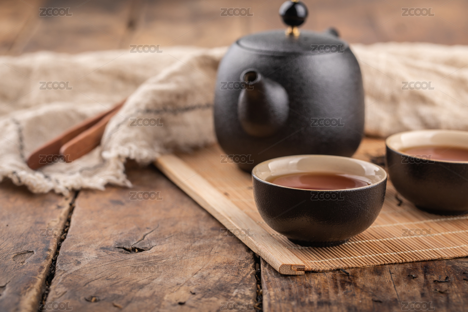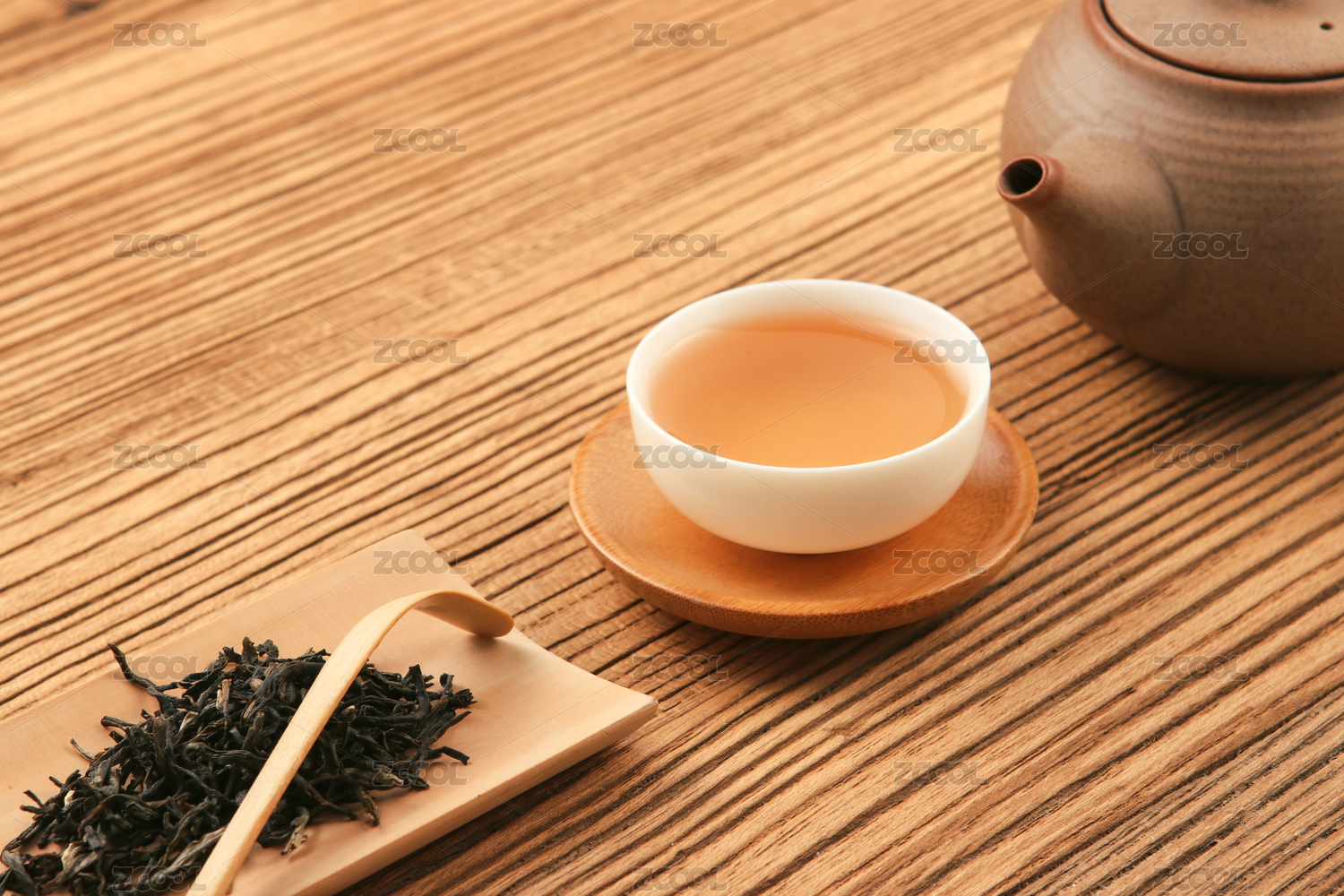 中式茶席上木托盘里的白瓷杯里的茶汤