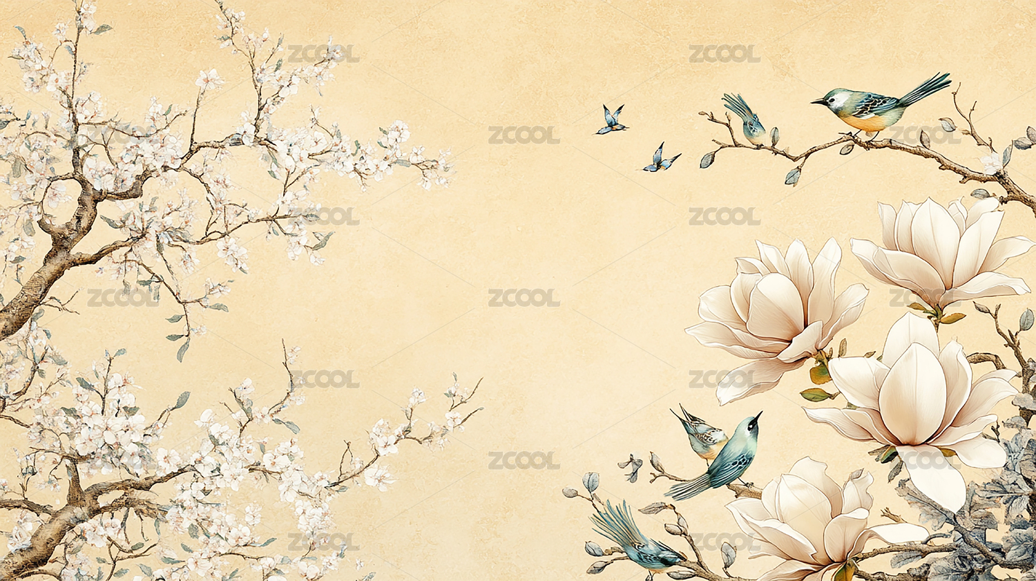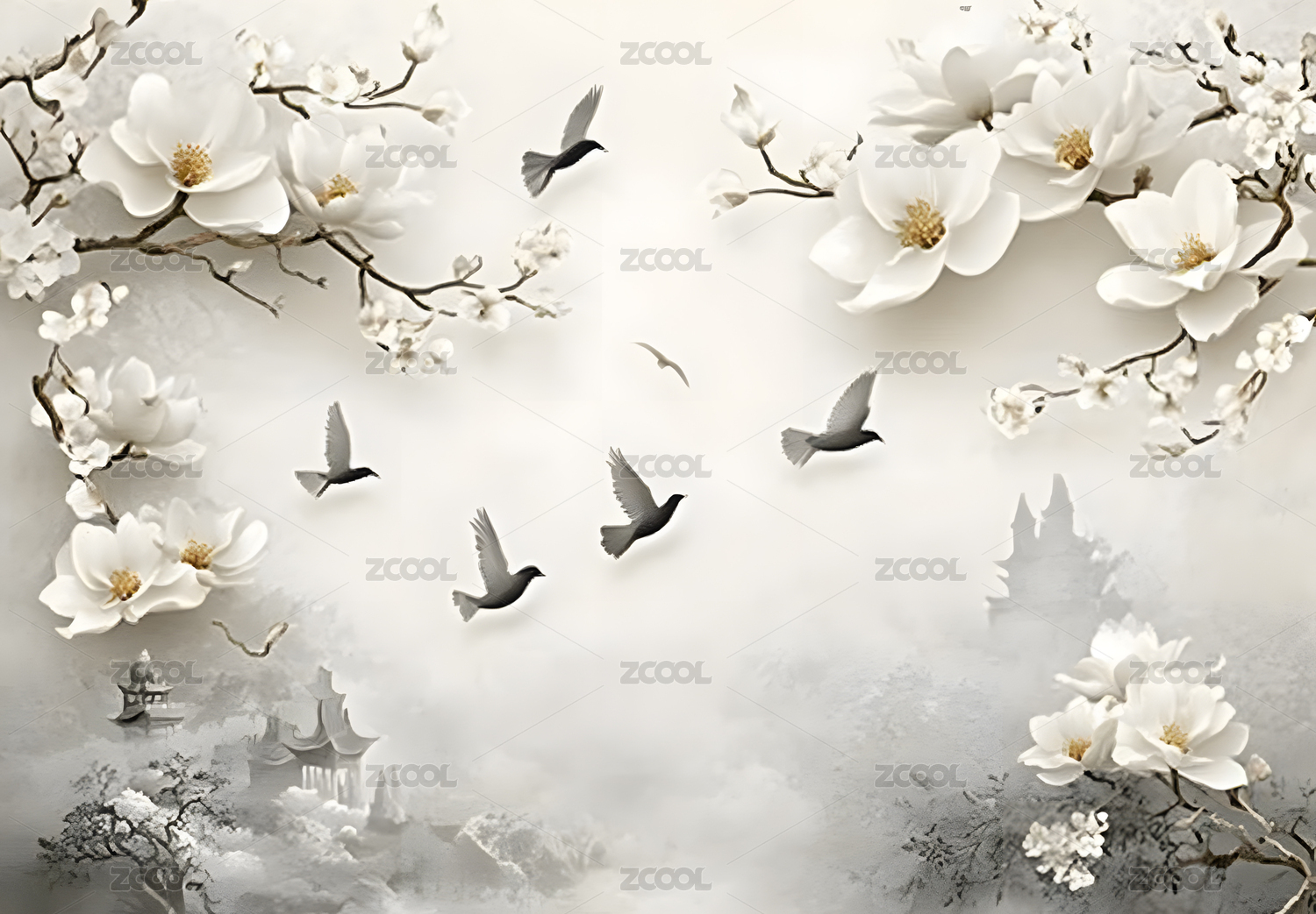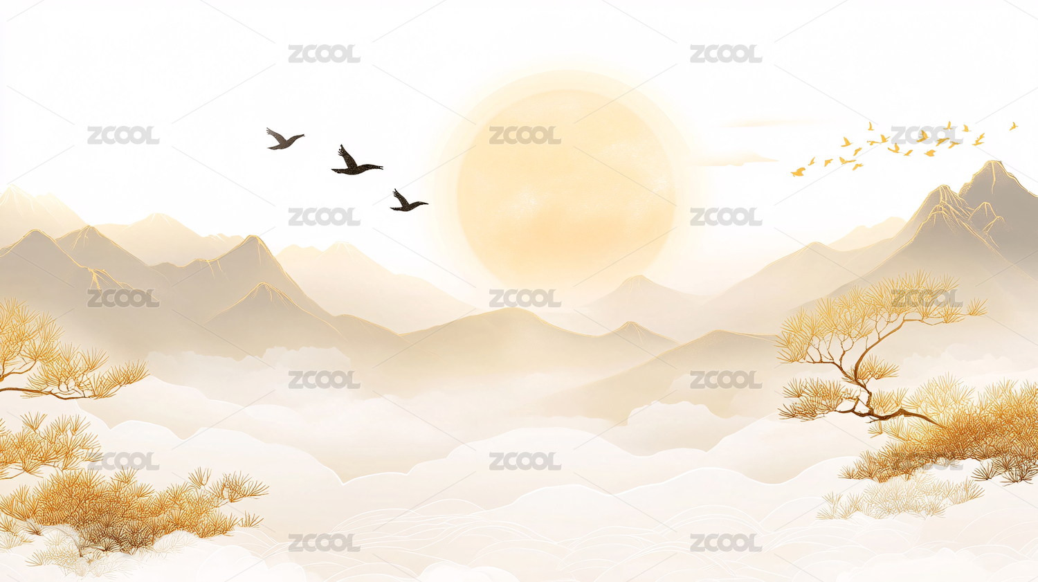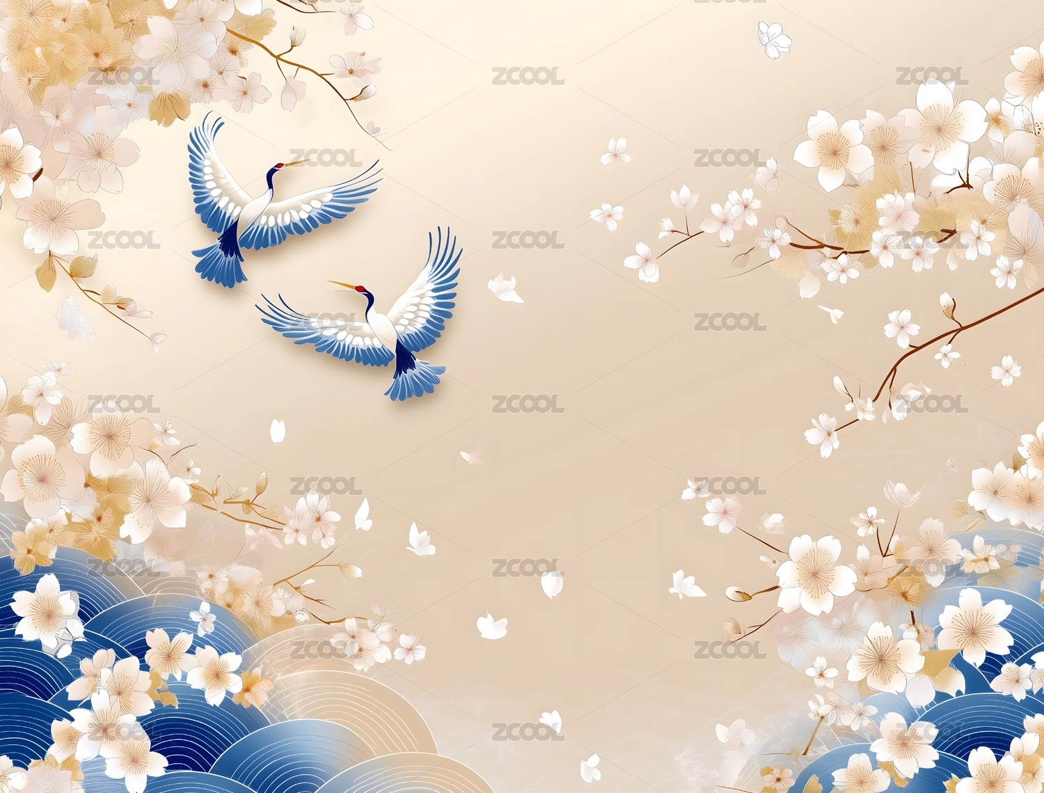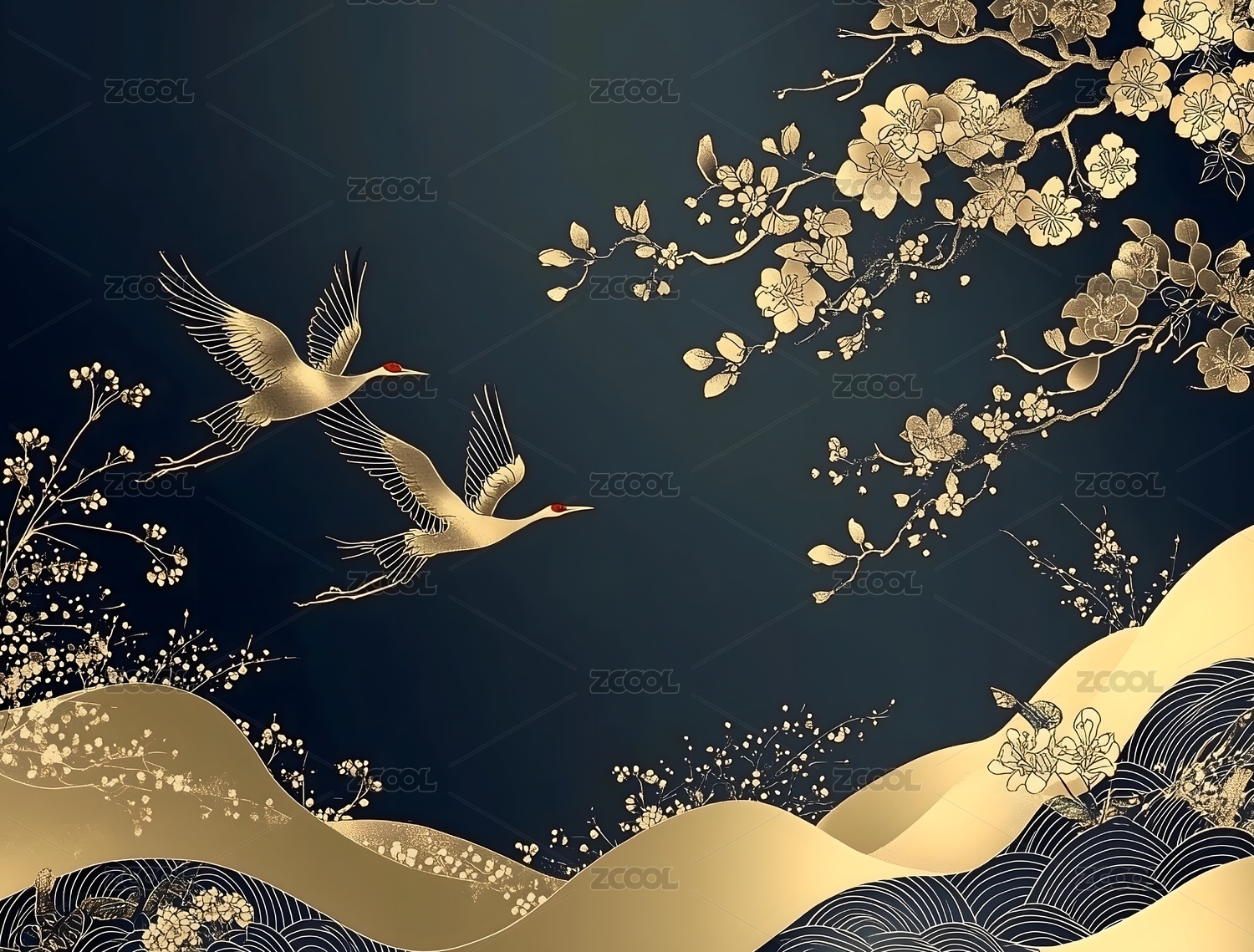 仙鹤迎着落日天空飞翔,伴有金色菊花
