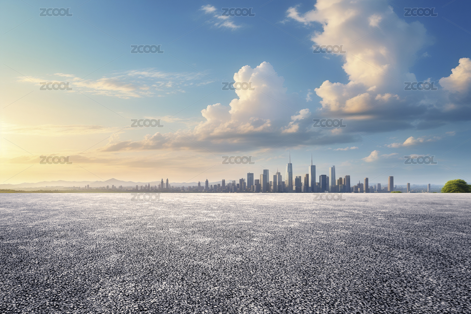 重庆建筑群景观和空的沥青道路在夏天日落时