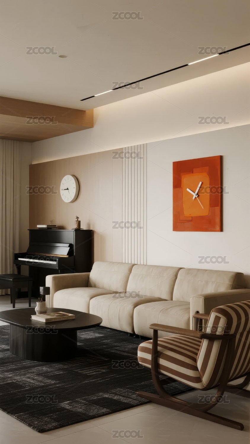 现代客厅布置简约钢琴沙发和挂钟