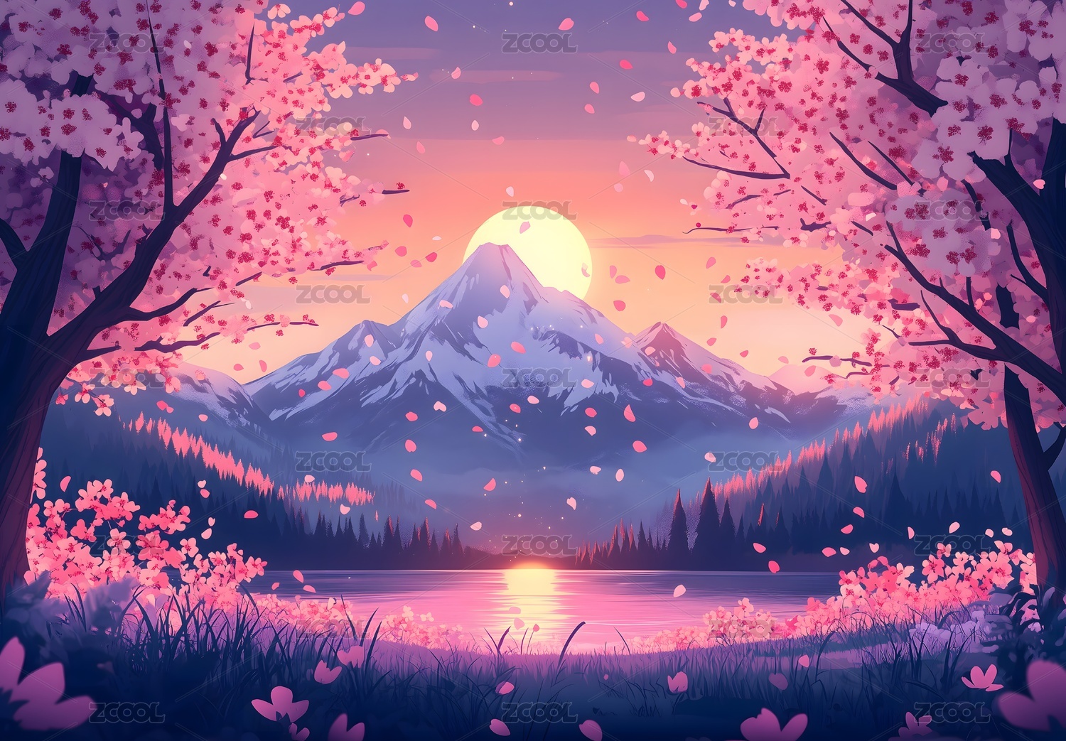 樱花湖畔春景图