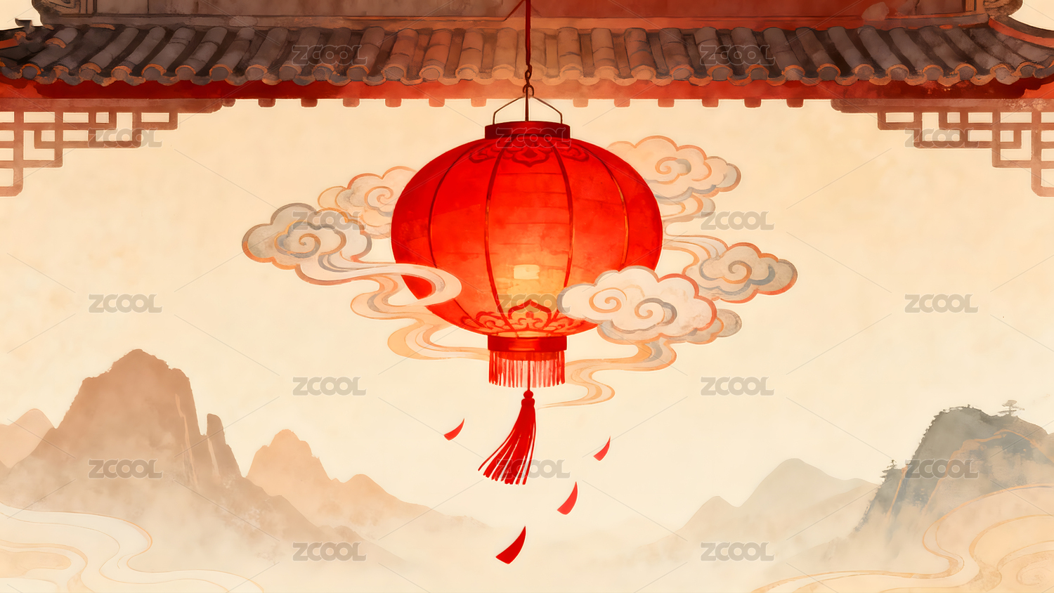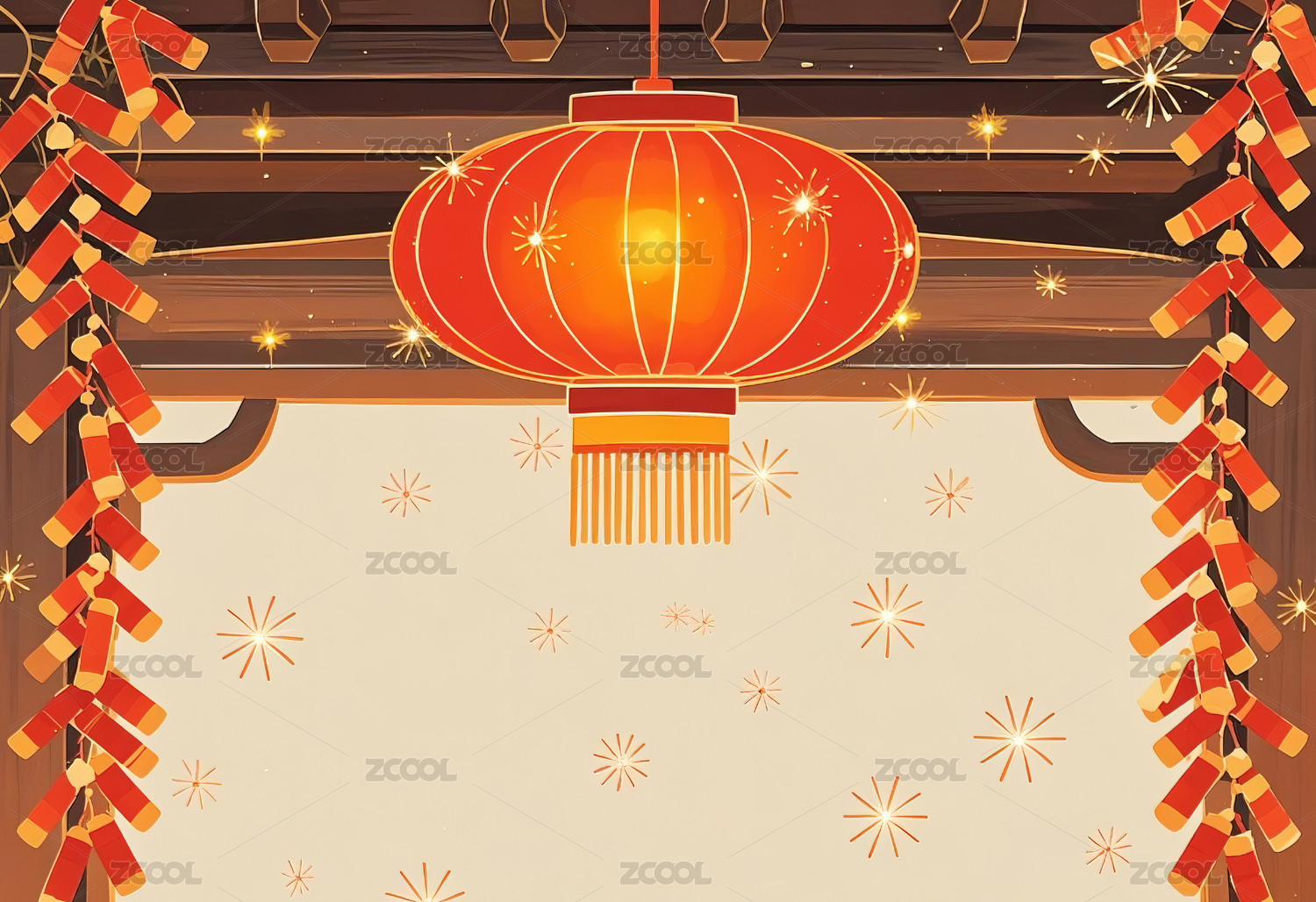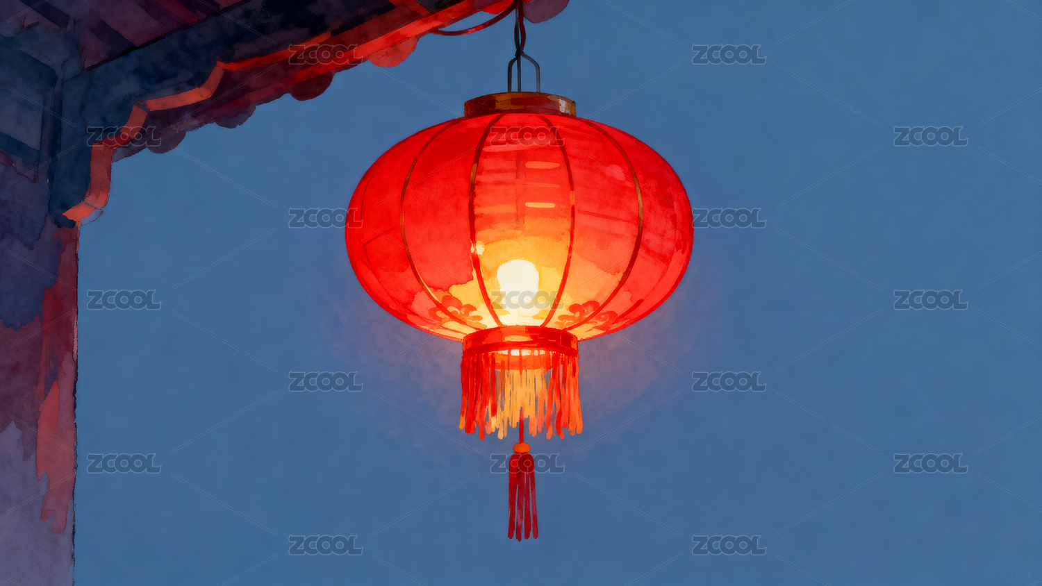 新年宅院古代建筑大门门口挂灯笼贴福字