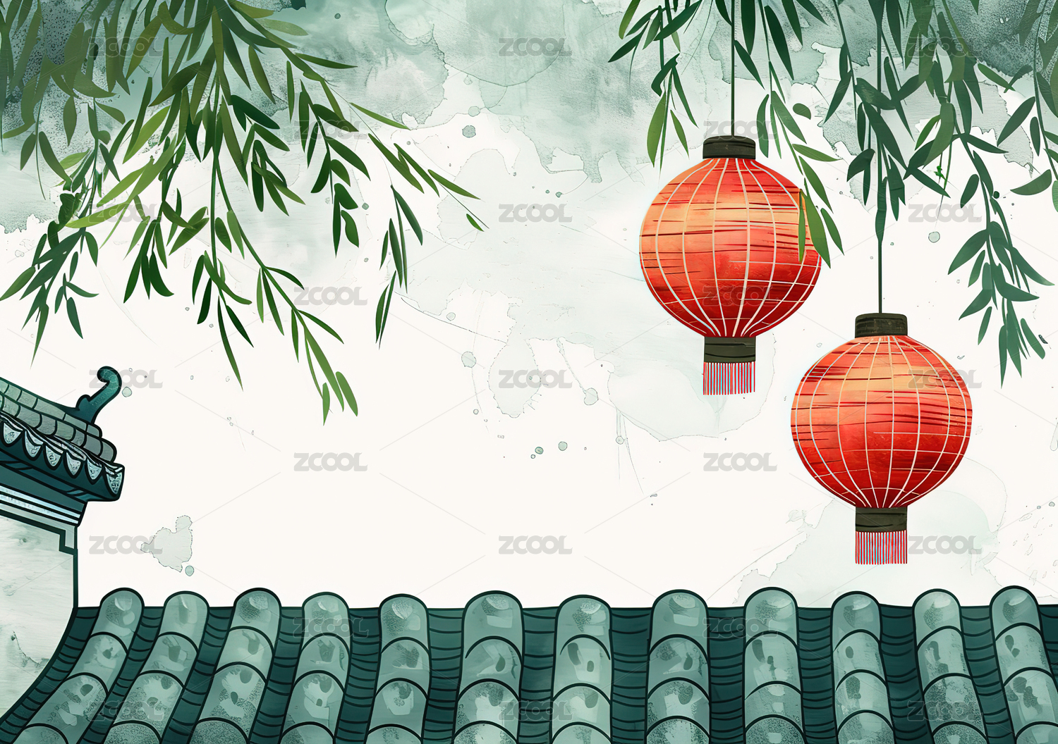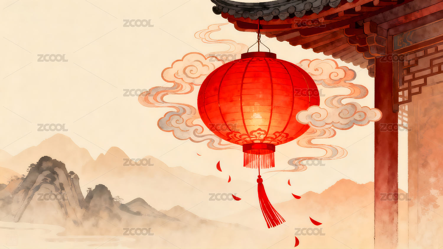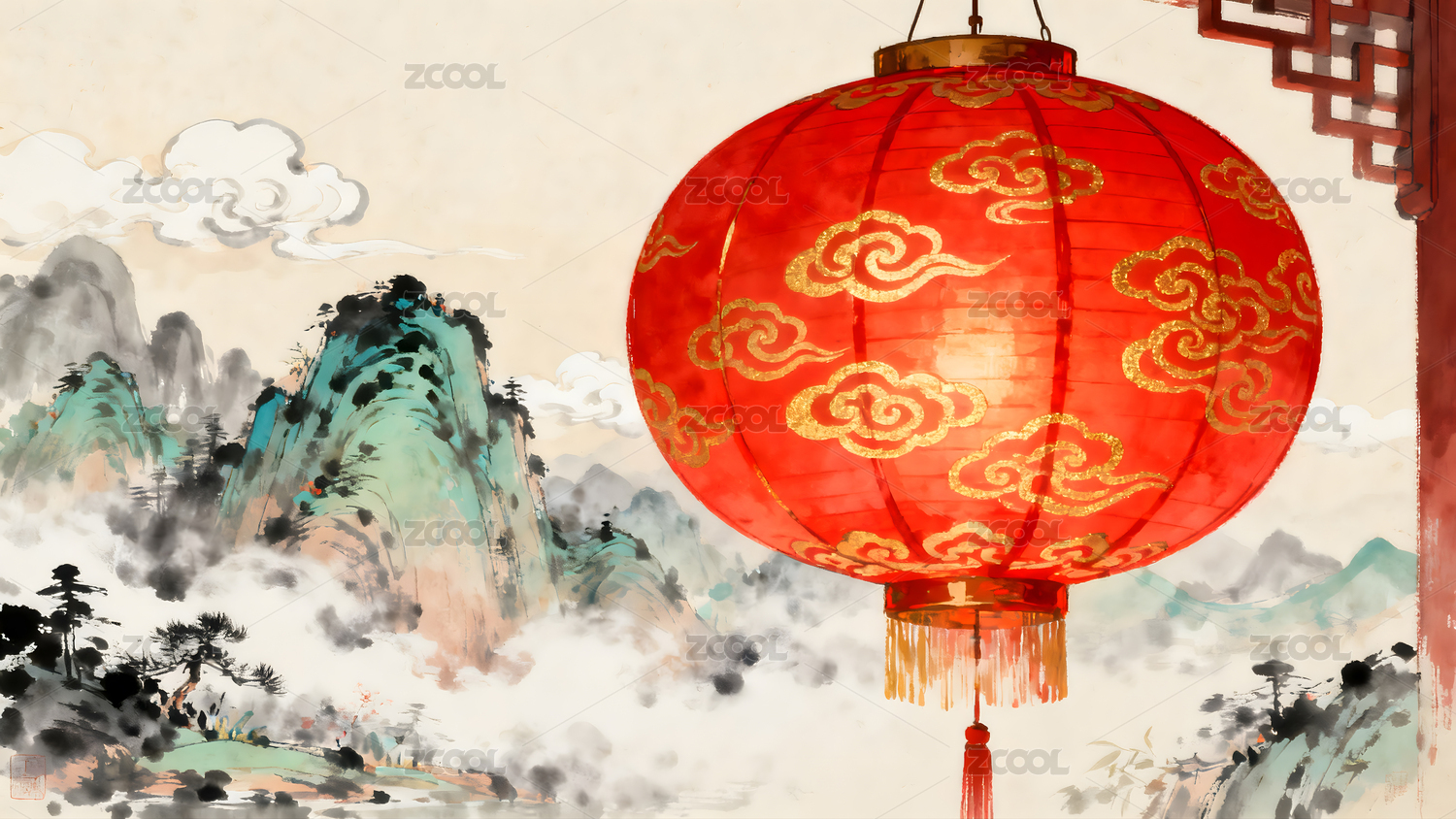 新年宅院古代建筑大门门口挂灯笼贴福字