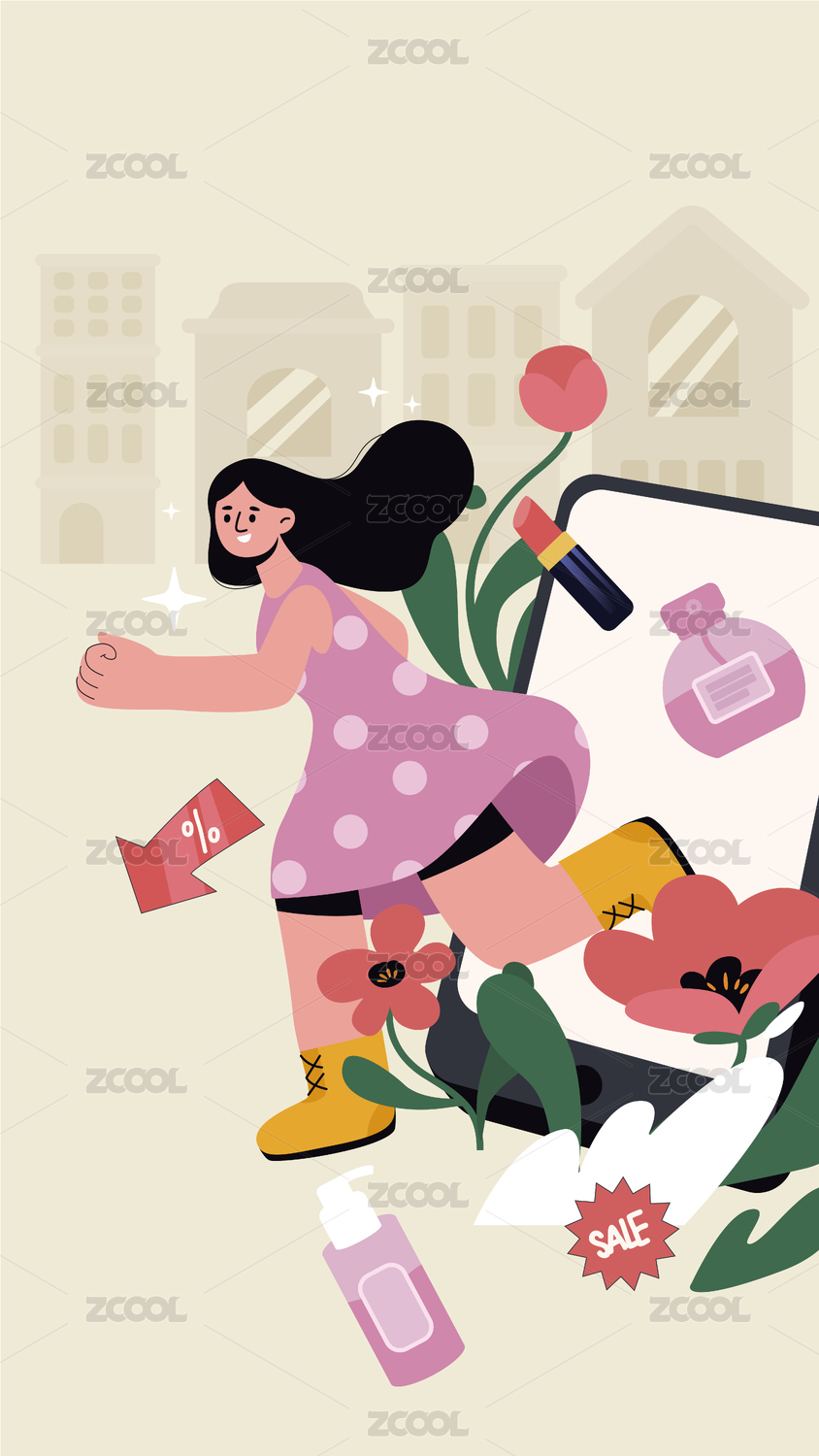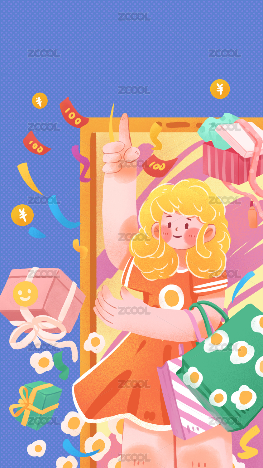 粉色女孩与冰激凌甜品矢量插画手机壁纸