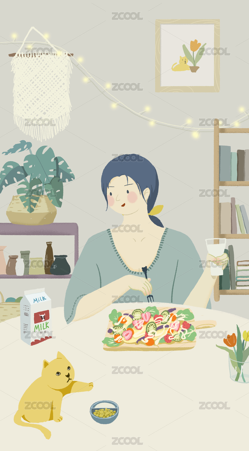 吃沙拉和牛奶的女孩和吃猫粮的橘猫