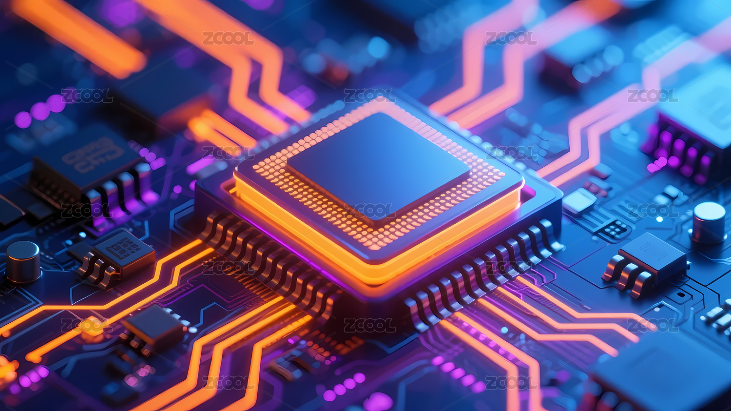 蓝红电子元件与中央芯片