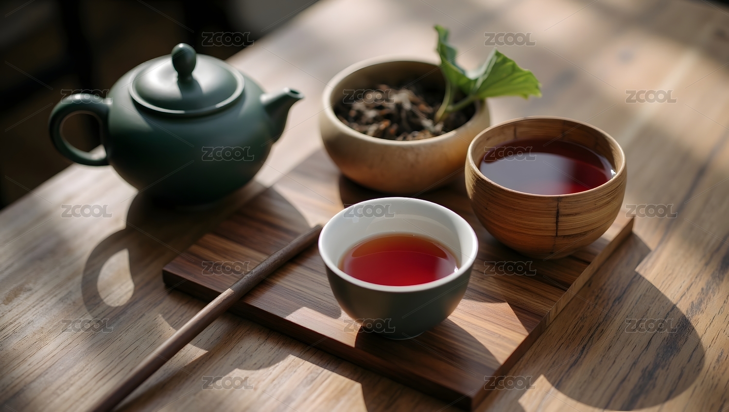 木纹桌亚麻茶席上放着茶壶和普洱茶汤
