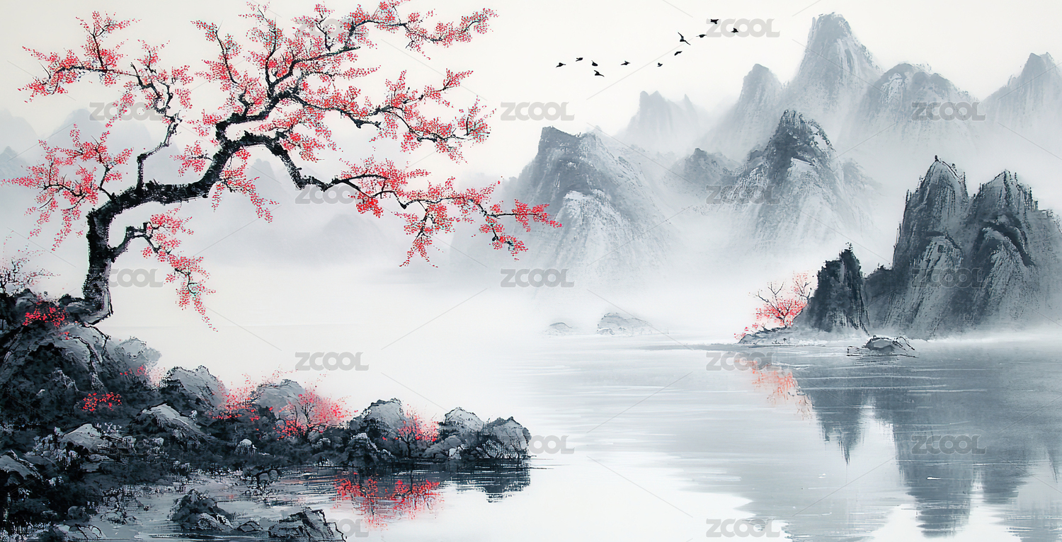 中国风水墨山水画上方留白中国山川