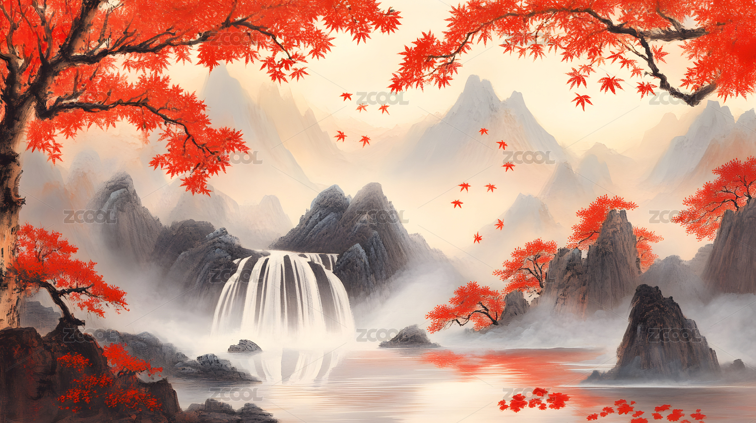 红叶漫山瀑布山水景致