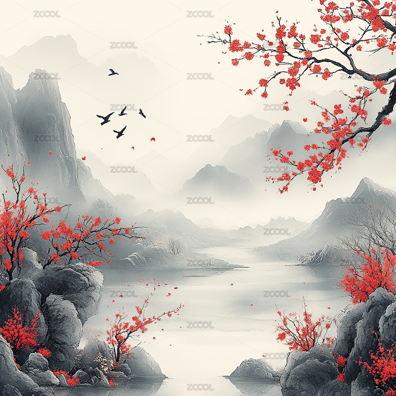 唯美自然风景国潮插画