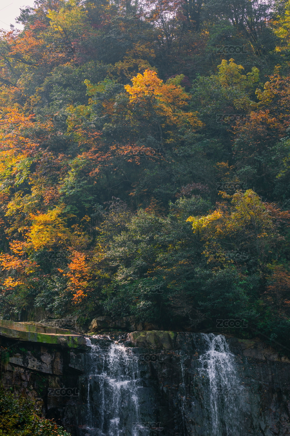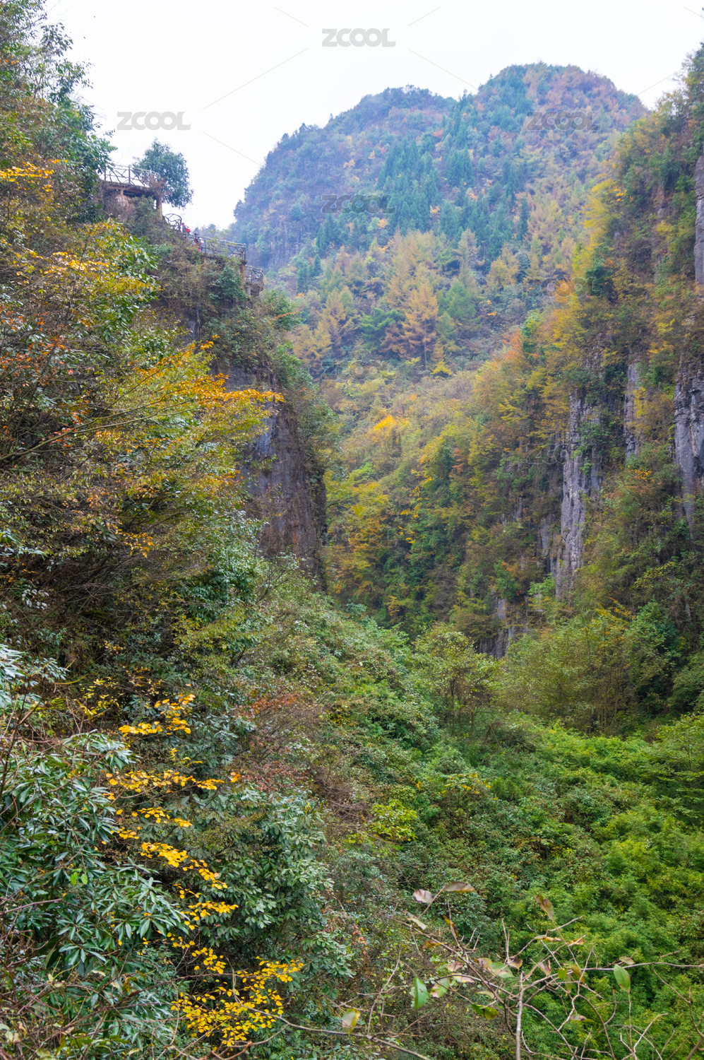 中国四川阿坝州茂县高山峭壁秋色彩林风景