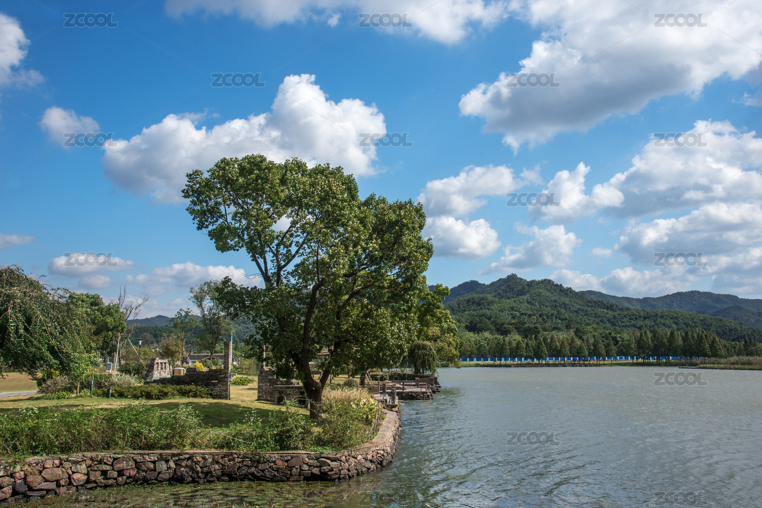 蓝天白云下的中国浙江宁波东钱湖湿地公园