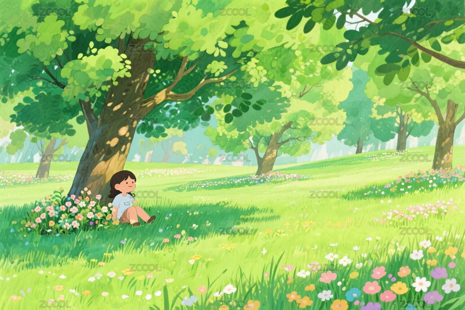 草地上休息的可爱女孩卡通插画