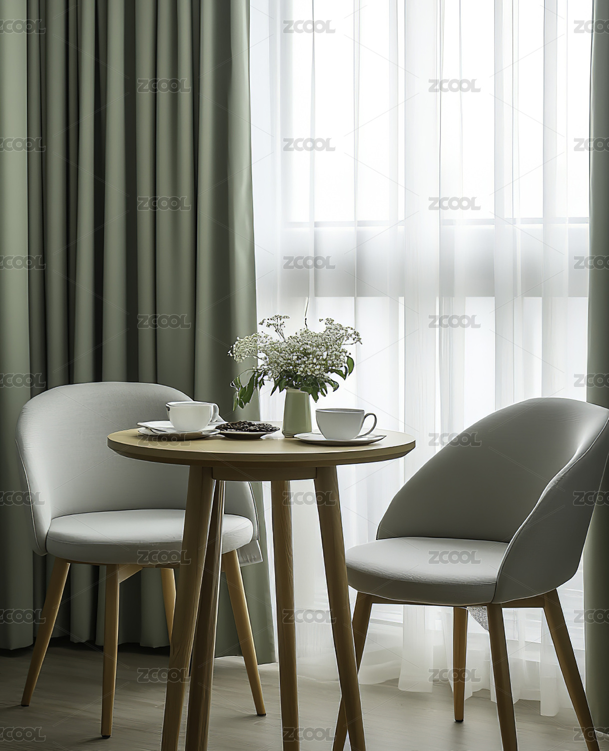 用餐区,现代,木质,椅子,桌子,圆形,淡色,薄荷绿,窗帘,花