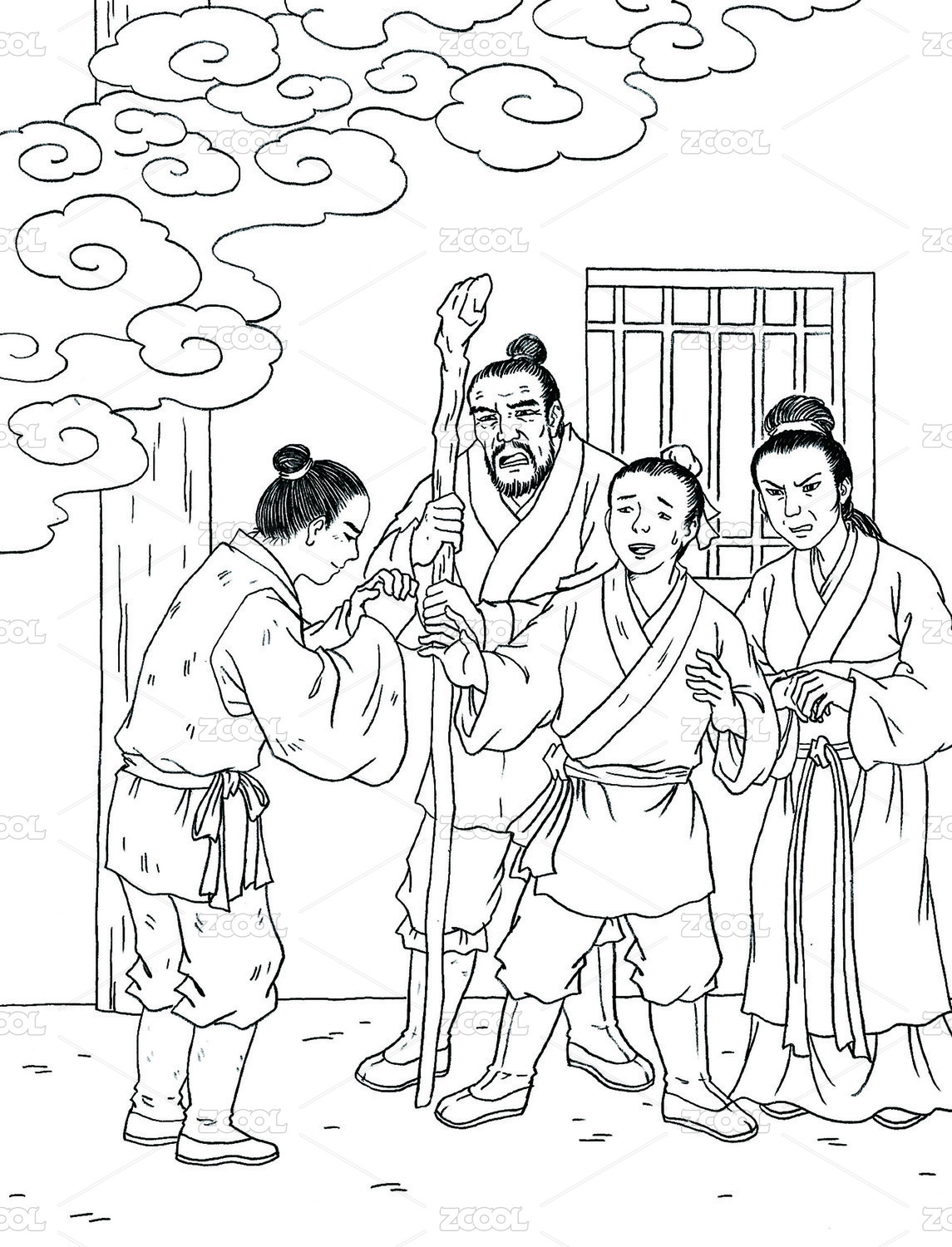 古风白描线稿 母子在隧道里相见