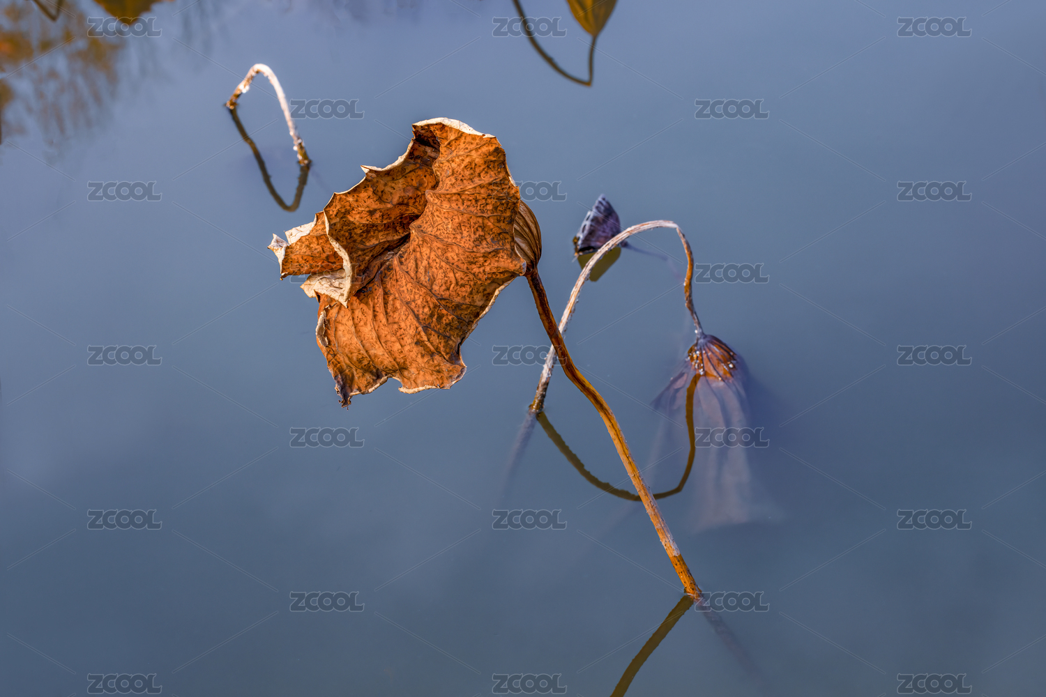 深秋季节水塘里干枯的荷叶