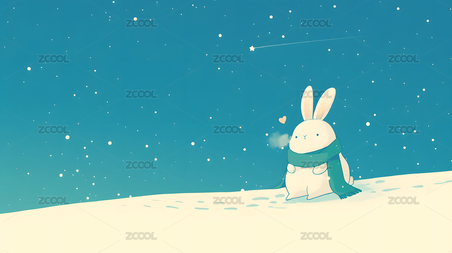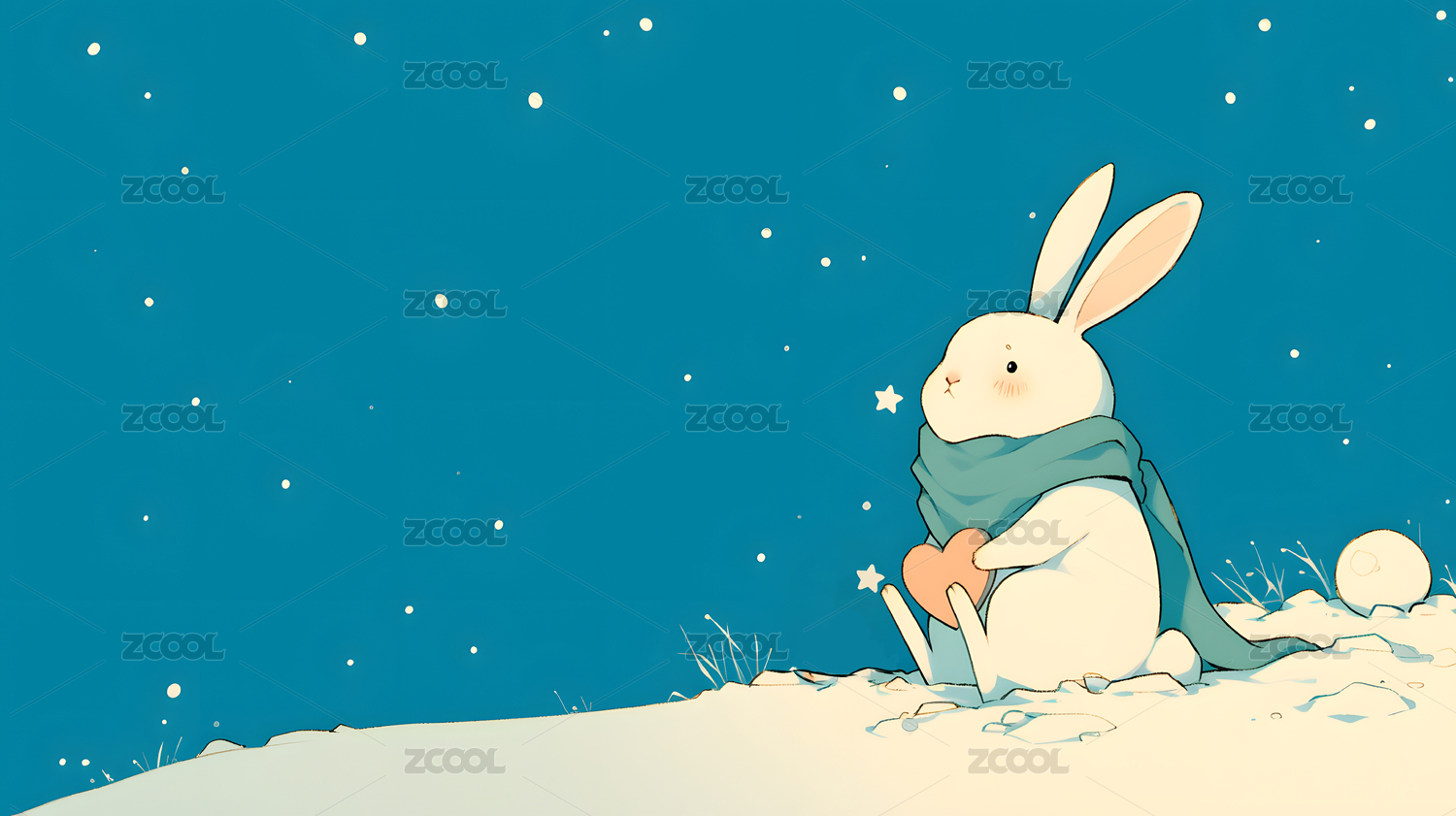 雪地上坐在月亮下围着围巾的可爱小白兔