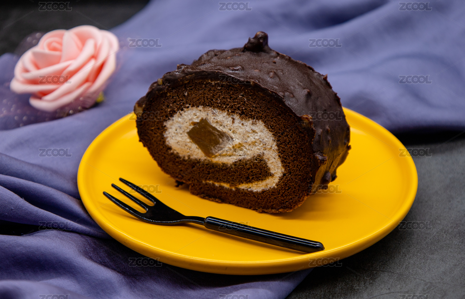 巧克力瑞士卷蛋糕摆放在桌面上特写