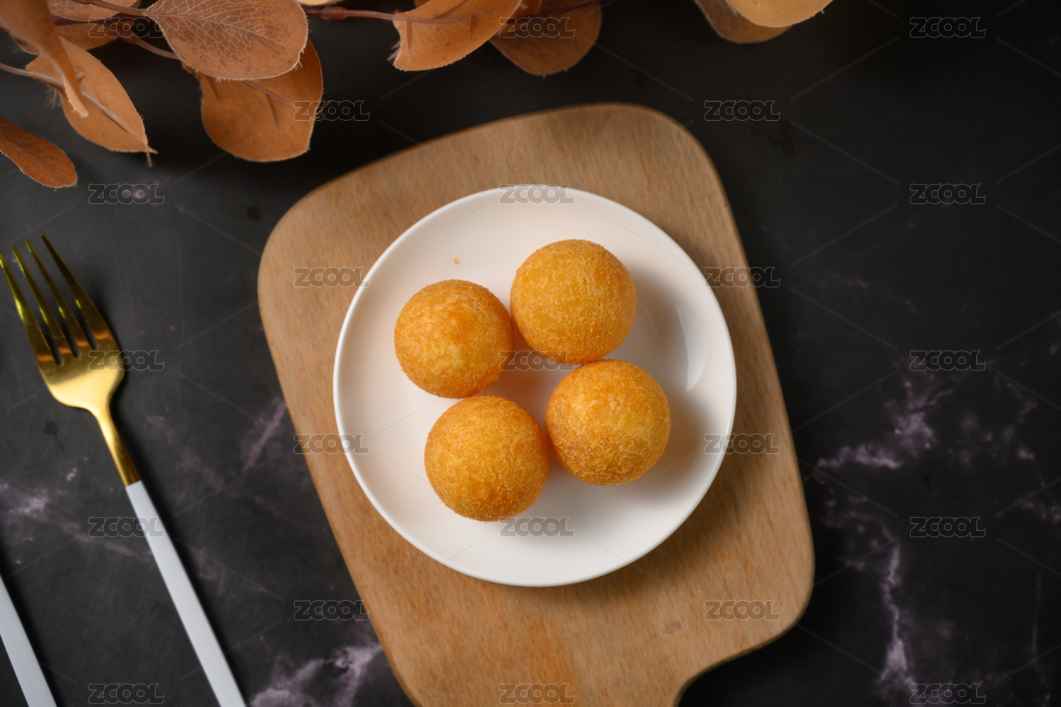 桌面上的盘子里的美味可口的地瓜芝士丸