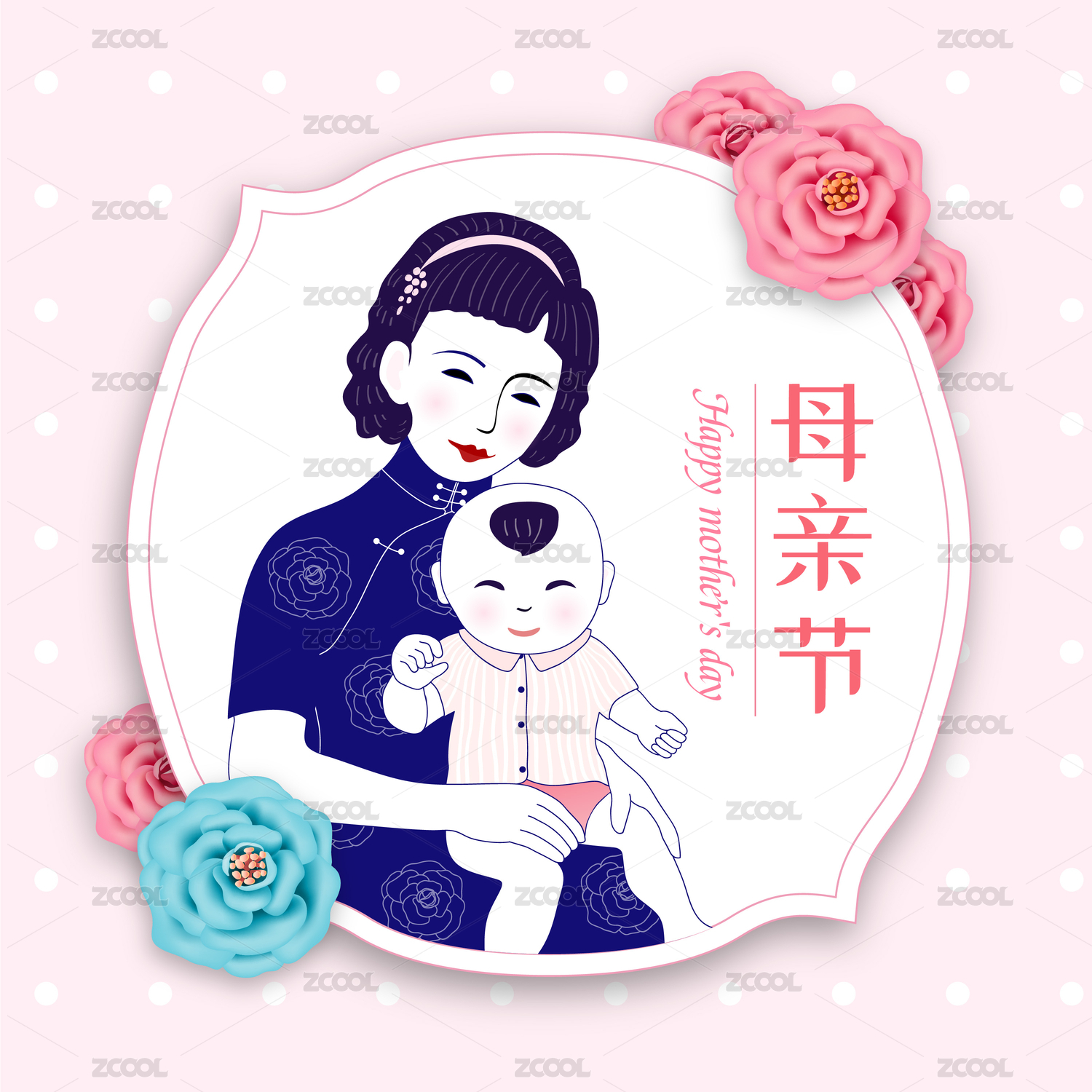 妈妈抱着小孩眼里充满爱母亲节矢量插画海报