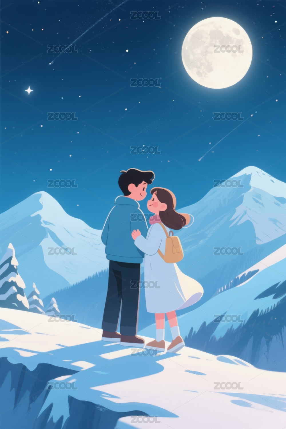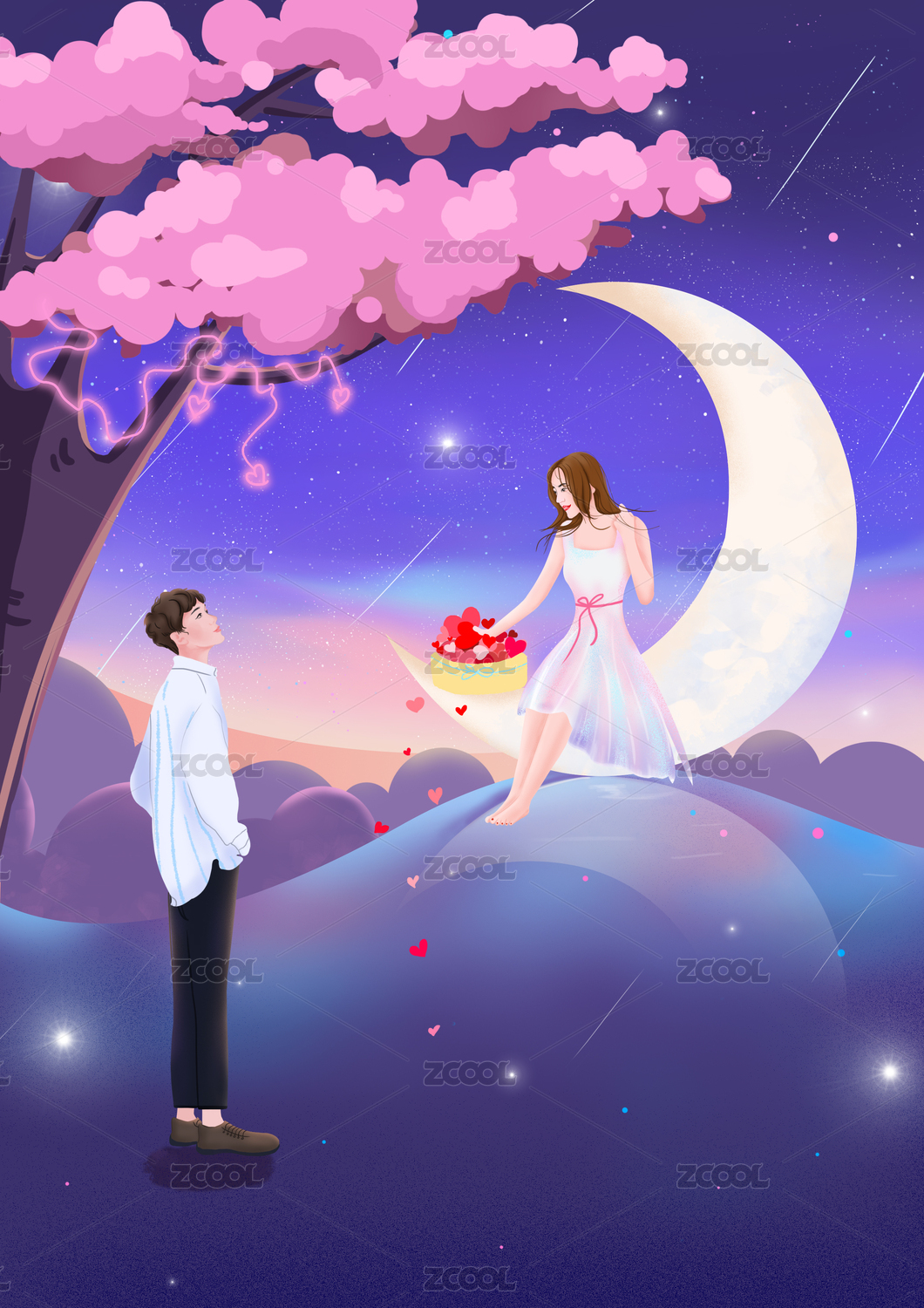 情人节夜晚弯月旁花丛中约会的甜蜜情侣插画