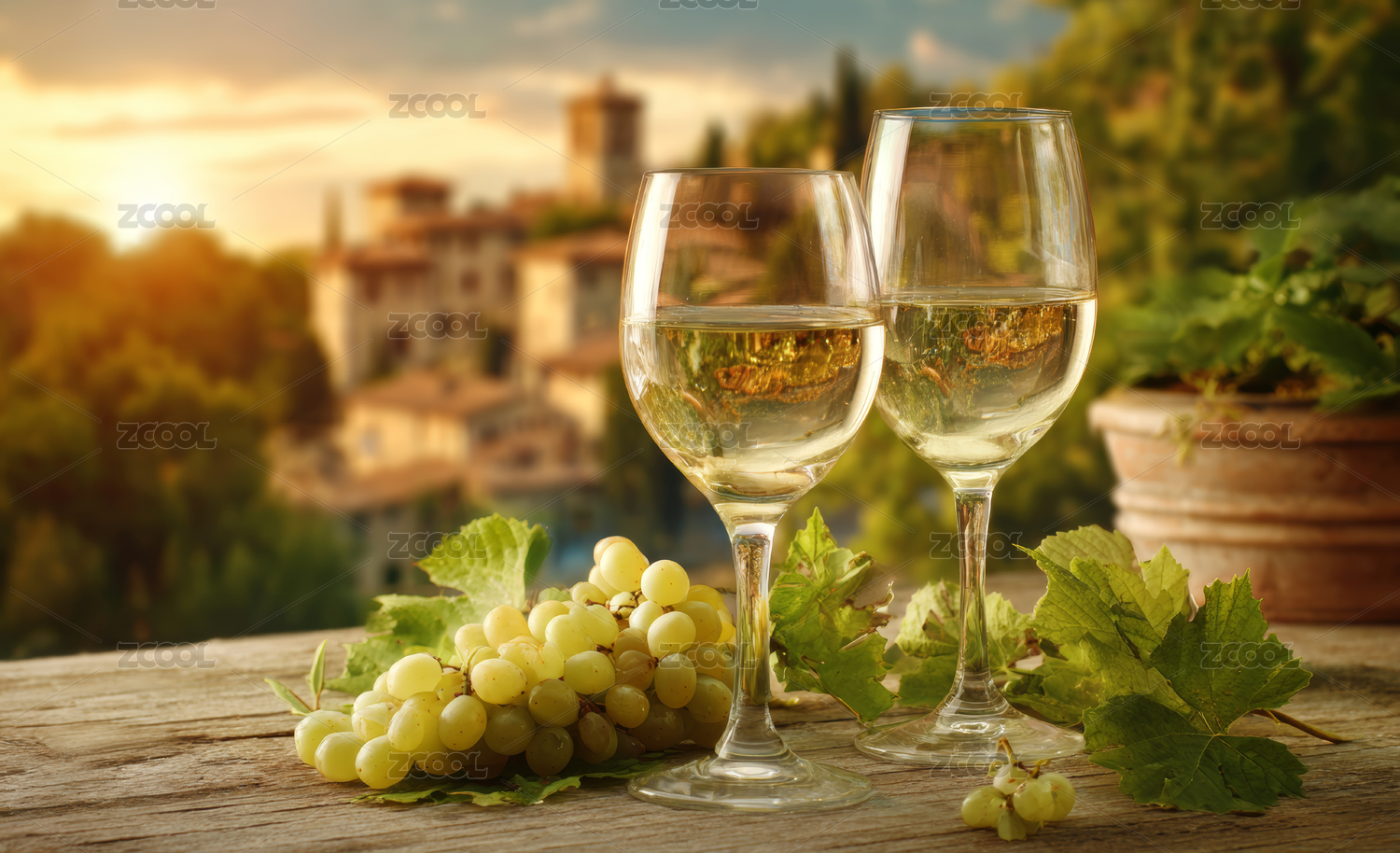 葡萄酒,瓶子,酒杯,葡萄,园景,日落,木桌,椅子,树叶,天空