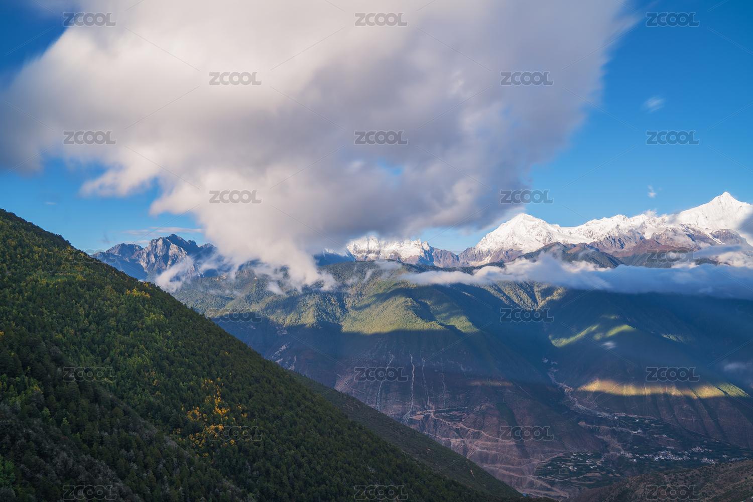 春季上午晴空多云的梅里雪山阳光照在山坡上