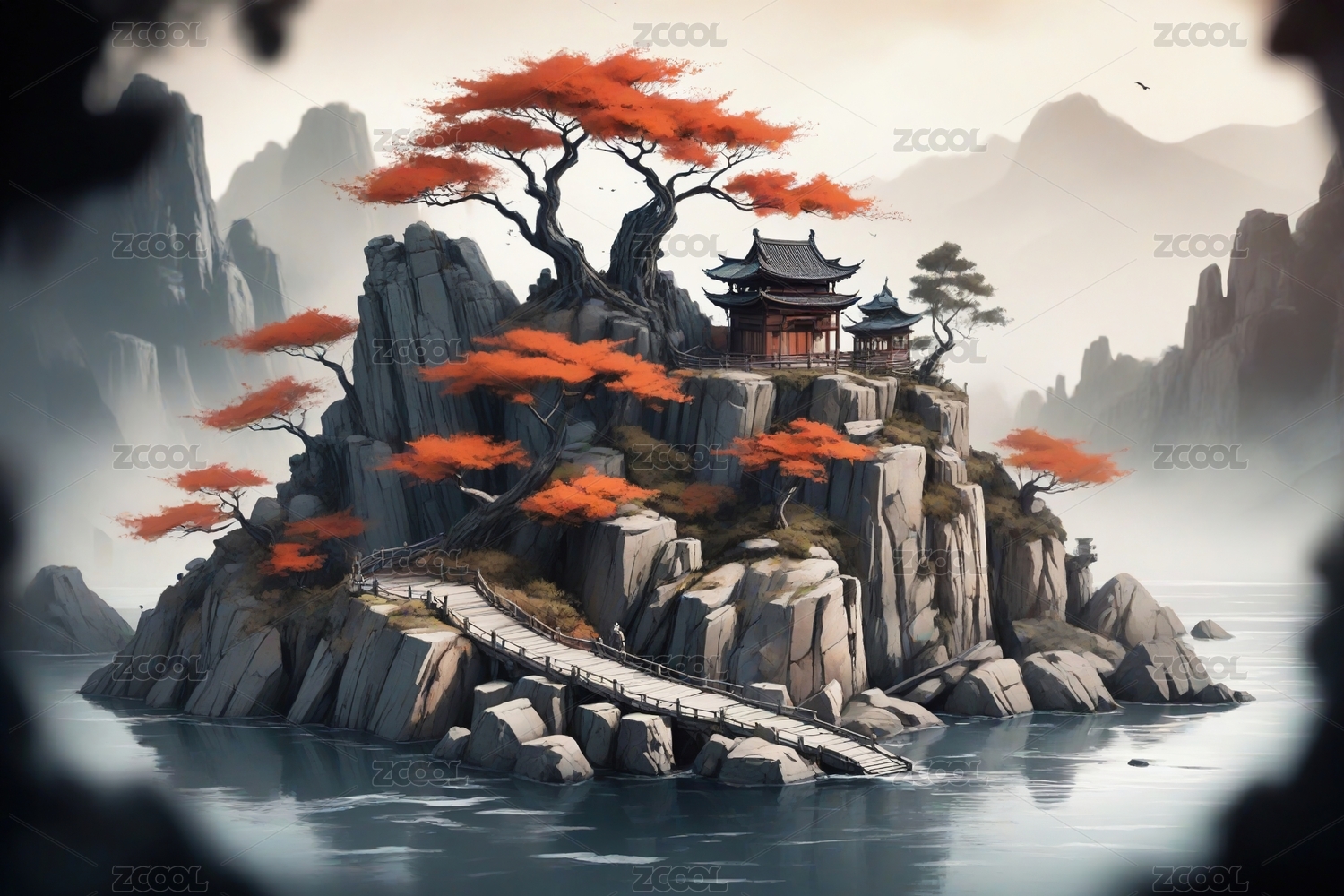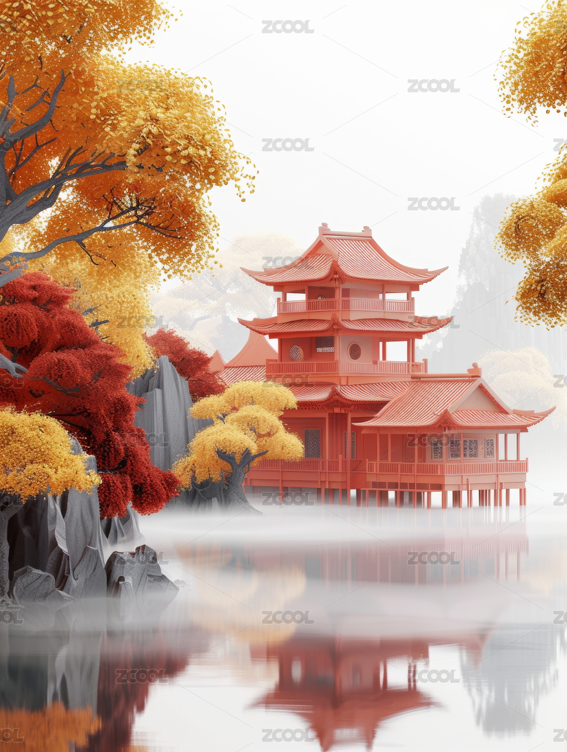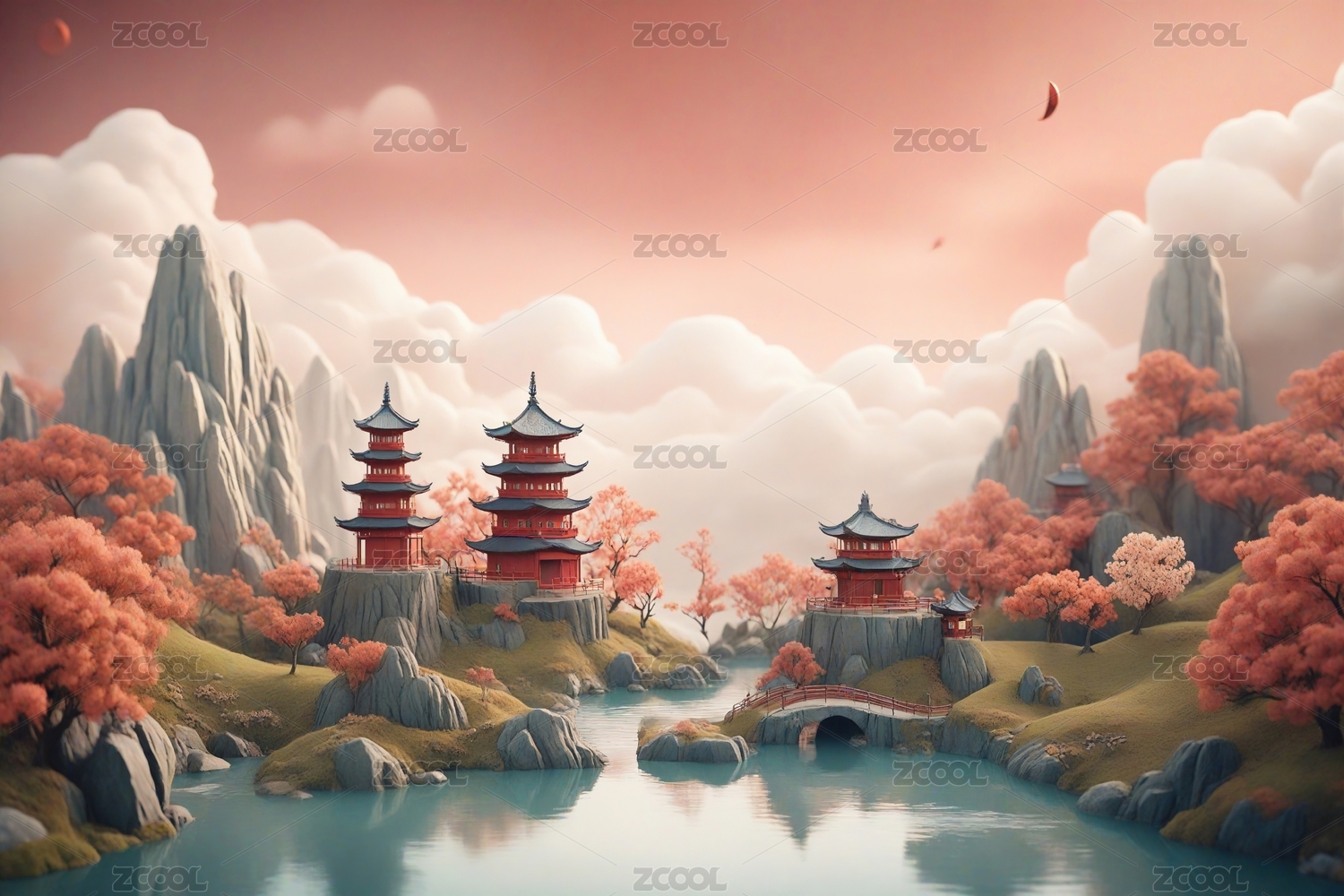中国风立体亭台楼阁,意境山水创意设计