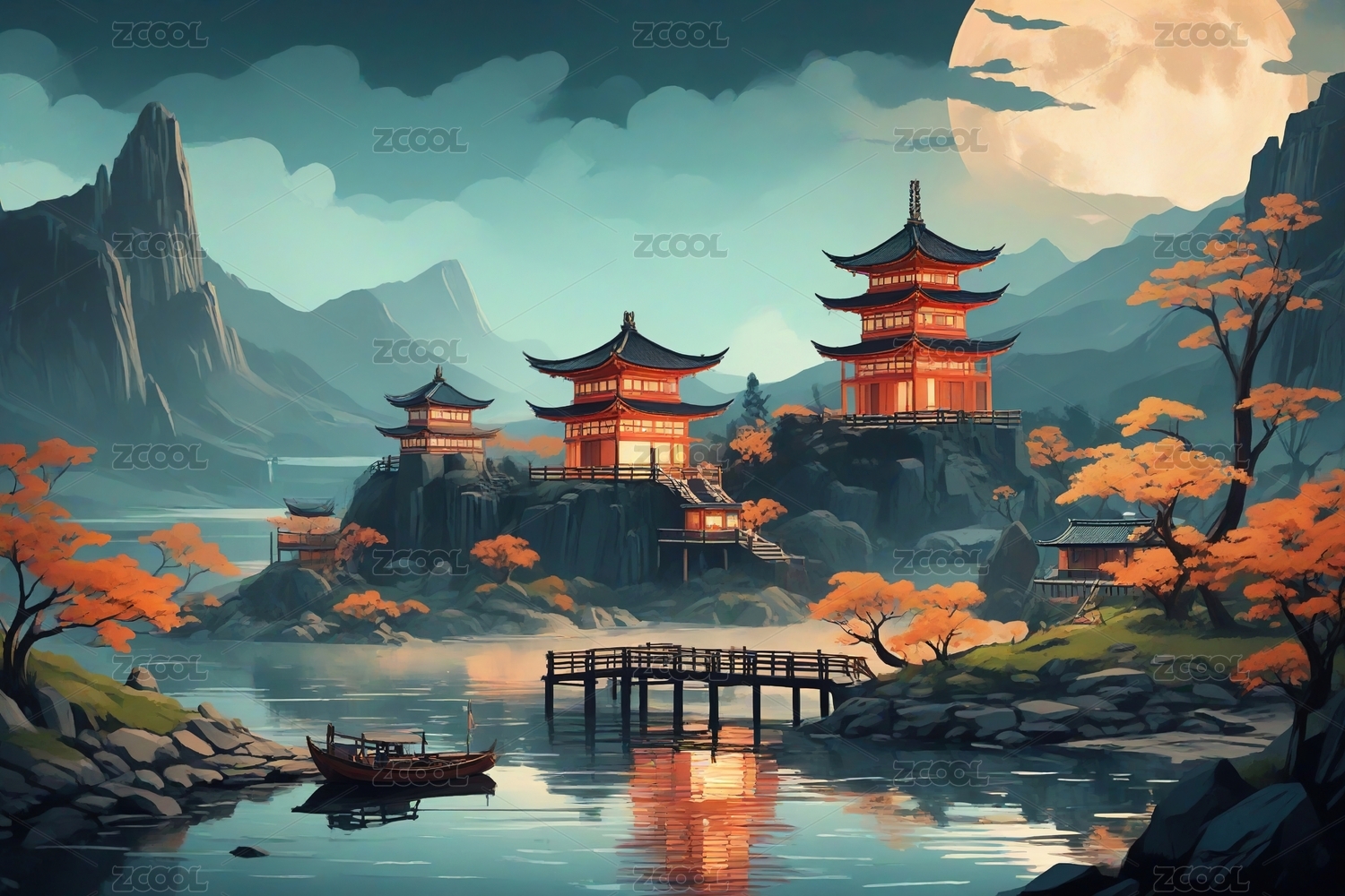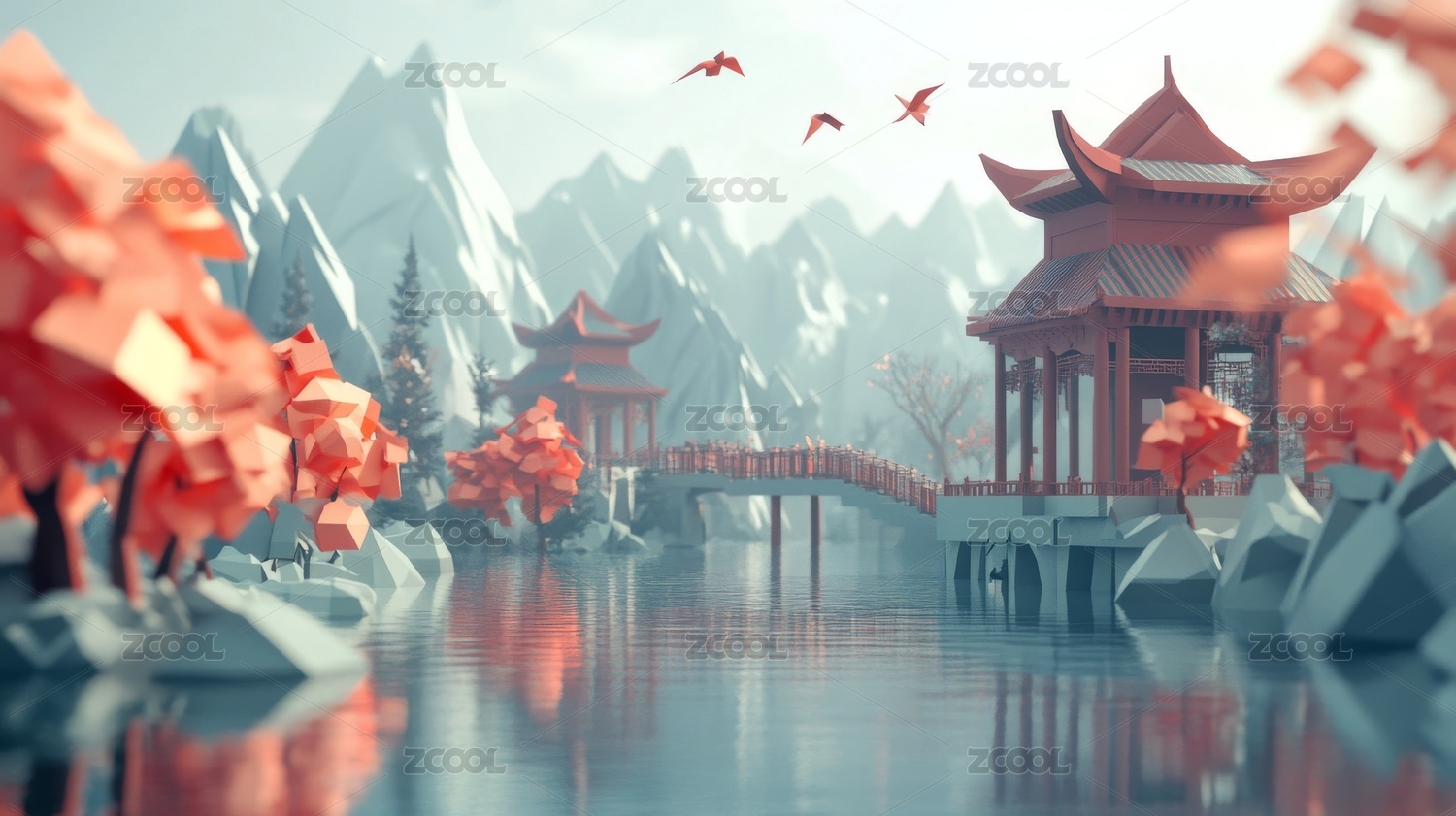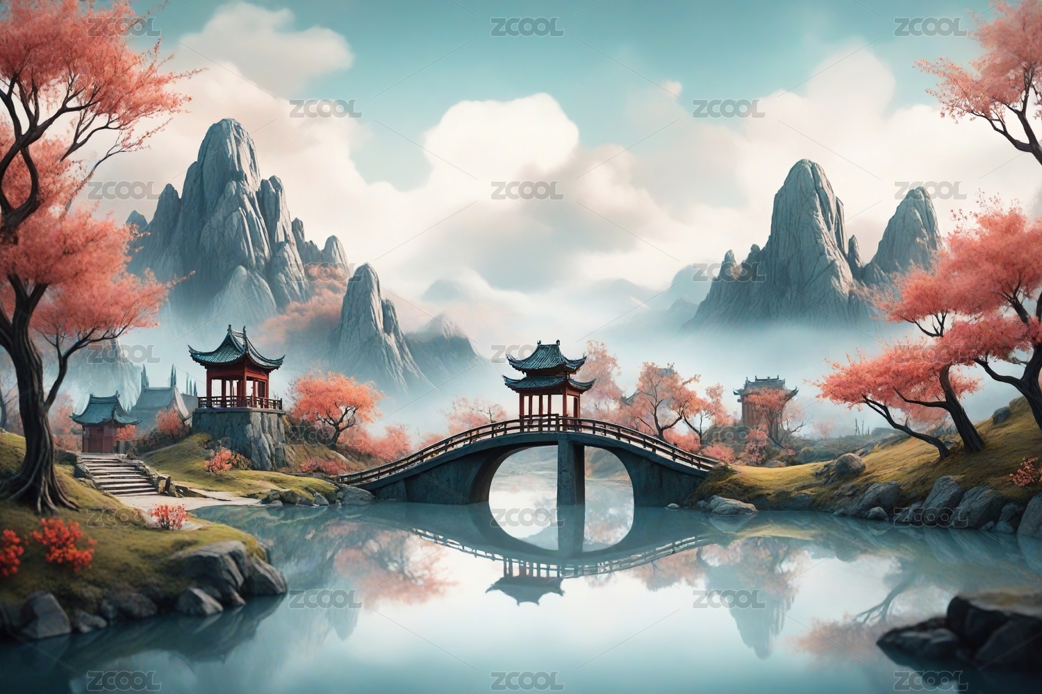 中国风立体亭台楼阁,意境山水创意设计