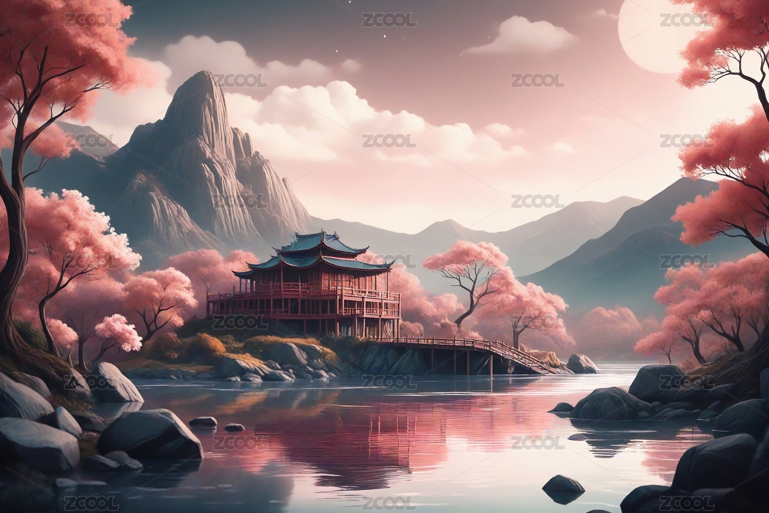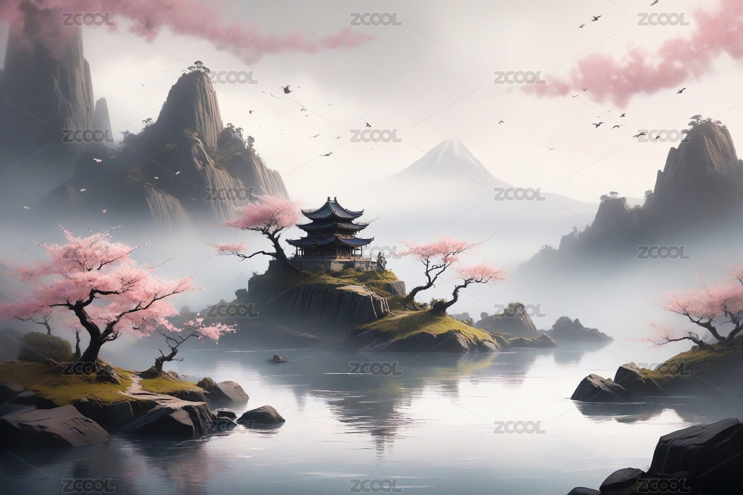 樱花盛开的山水画主题