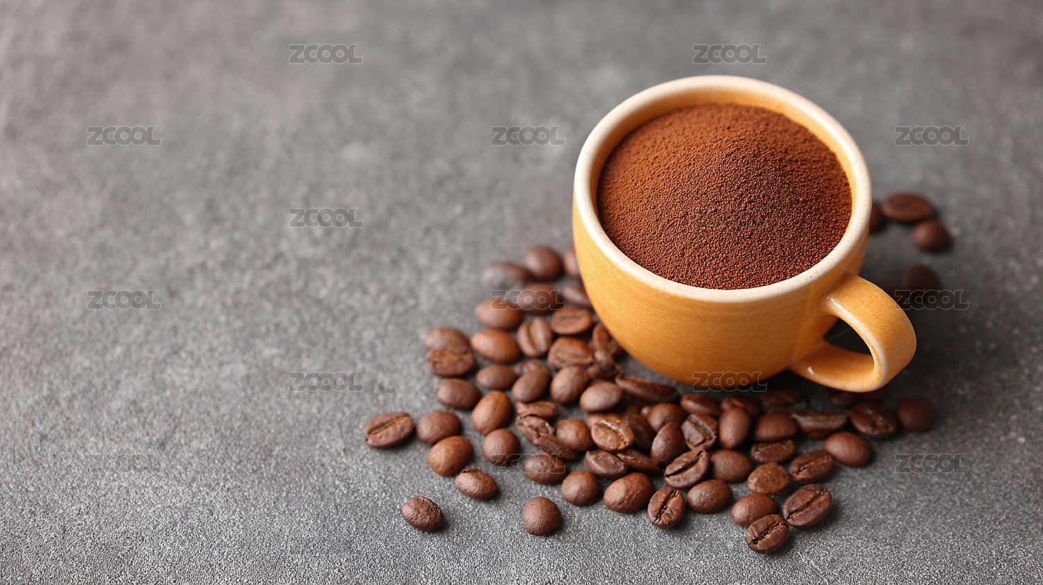 骨瓷咖啡杯里的咖啡粉末和咖啡