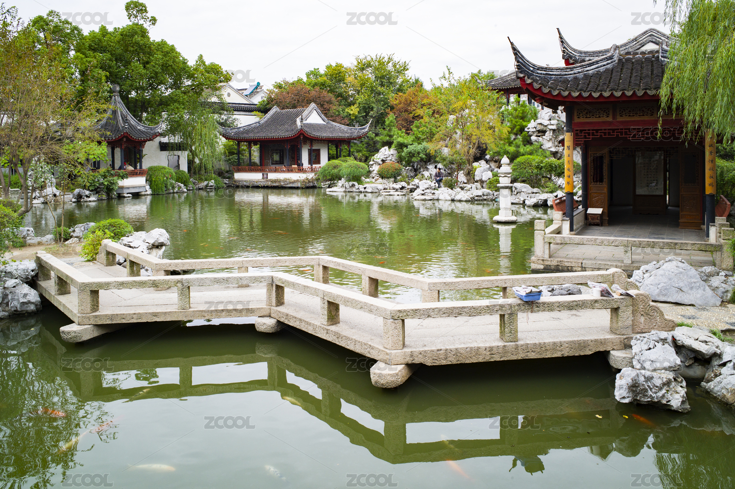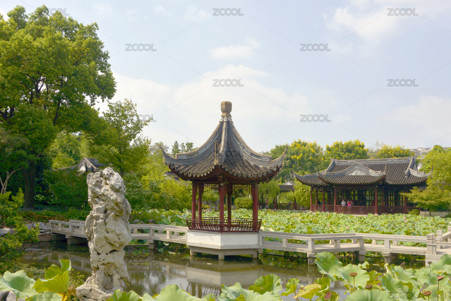 中国上海古猗园鸳鸯湖上九曲桥的隐香亭
