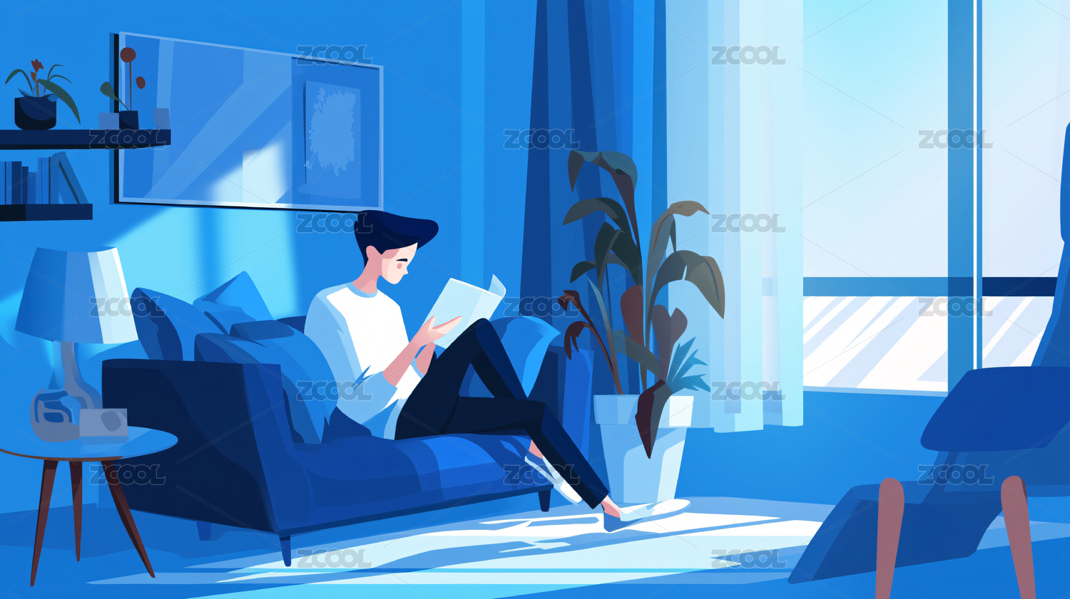 客厅里工作的女人, 手绘扁平人物场景创意概念插画