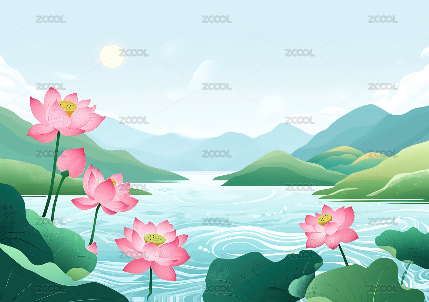 国风抽象莲花荷叶风景插画