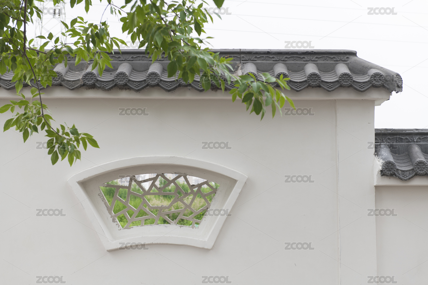 中国浙江杭州郭庄方形窗外的中式建筑景观