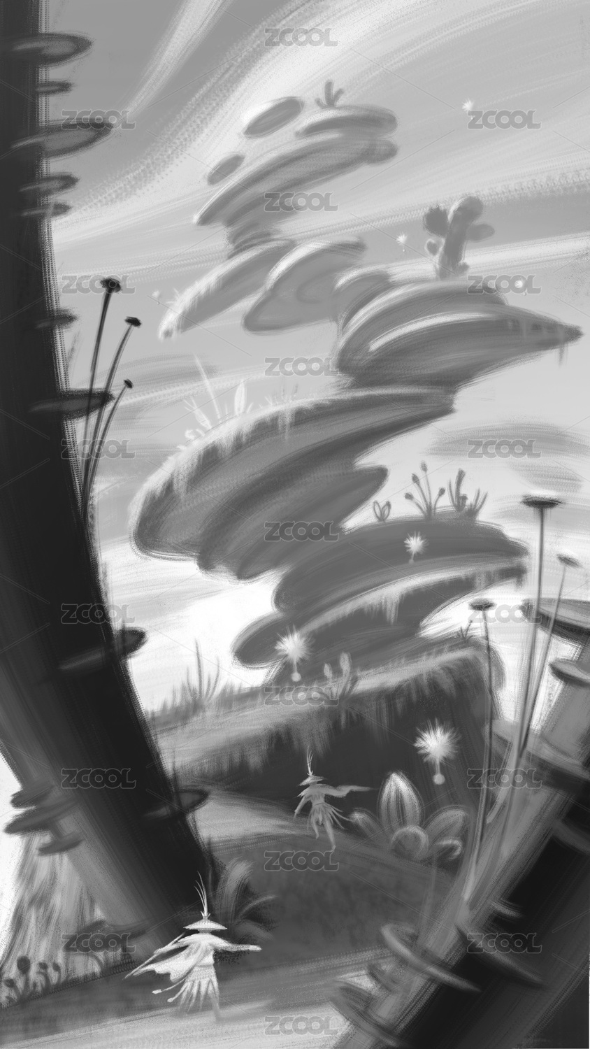 原画场景,影视概念美术,游戏场景,场景原画,素描,黑与白,单色,悬浮岛,插画,奇幻